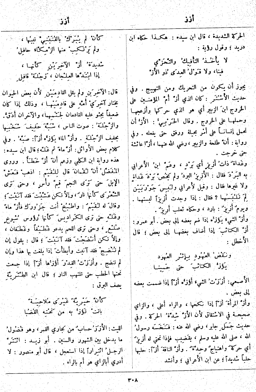 قَالَ: الآخِرَينِ وَلَمْ يَقُلِ القادِمَيْنِ لأَن بَعْضَ الْحَيَوَانِ يَخْتَارُ آخِرَيْ أُمِّهِ عَلَى قادِمَيْها، وَذَلِكَ إِذا كَانَ ضَعِيفًا يَجْثُو عَلَيْهِ الْقَادِمَانِ لجَثْمِهما، وَالْآخَرَانِ أَدَقُّ. والزَّجْلَةُ: صَوْتُ النَّاسِ، شَبَّهَ حَفِيفَ شَخْبِها بِحَفِيفِ الزَّجْلَةِ. وأَزَّ الماءَ يَؤُزُّه أَزّاً: صَبَّهُ. وَفِي كَلَامِ بَعْضِ الأَوائل: أُزَّ مَاءً ثُمَّ غَلِّه؛ قَالَ ابْنُ سِيدَهْ: هَذِهِ رِوَايَةُ ابْنِ الْكَلْبِيِّ وَزَعَمَ أَنّ أُزَّ خَطَأٌ. وَرَوَى المُفَضَّلُ أَنَّ لُقْمانَ قَالَ لِلُقَيْم: اذهبْ فَعَشِّ الإِبلَ حَتَّى تَرَى النجمَ قِمَّ رأْسٍ، وَحَتَّى تَرى الشِّعْرَى كأَنها نارٌ، وإِلَّا تَكُنْ عَشَّيْتَ فَقَدْ آنَيْتَ؛ وقالَ لَهُ لُقَيْمٌ: واطْبُخْ أَنت جَزُورَك فأُزَّ مَاءً وغَلِّهِ حَتَّى تَرَى الكَرادِيسَ كأَنها رُؤُوس شُيوخٍ صُلْعٍ، وَحَتَّى تَرَى اللَّحْمَ يَدْعُو غُطَيْفاً وغَطَفان، وإِلَّا تَكُنْ أَنْضَجْتَ فَقَدْ آنَيْتَ؛ قَالَ: يَقُولُ إِن لَمْ تُنْضِجْ فَقَدْ آنَيْتَ وأَبطأْتَ إِذا بَلَغْتَ بِهَا هَذَا وإِن لَمْ تَنْضَجْ. وأَزَزْتُ القِدْرَ أَؤُزُّها أَزّاً إِذا جَمَعْتَ تَحْتَهَا الْحَطَبَ حَتَّى تَلْتَهِبَ النَّارُ؛ قَالَ ابْنُ الطَّثَرِيَّةِ يَصِفُ الْبَرْقَ: