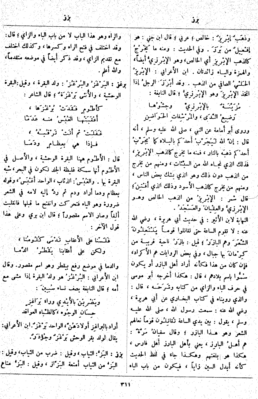 برغز: البَرْغَزُ والبُرْغُزُ: وَلَدُ الْبَقَرَةِ، وَقِيلَ: الْبَقَرَةُ الْوَحْشِيَّةُ، والأُنثى بَرْغَزَةٌ؛ قَالَ الشَّاعِرُ: