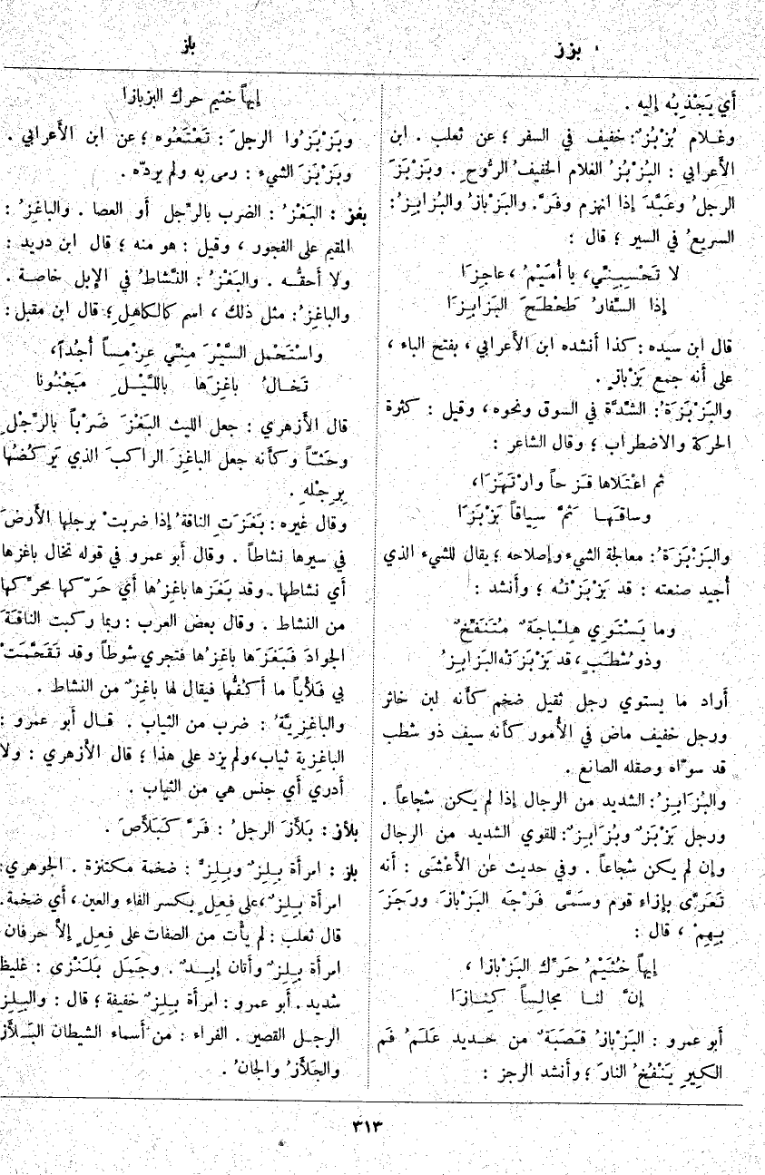 بغز: البَغْزُ: الضَّرْبُ بالرِّجل أَو الْعَصَا. والباغِزُ: الْمُقِيمُ عَلَى الْفُجُورِ، وَقِيلَ: هُوَ مِنْهُ؛ قَالَ ابْنُ دُرَيْدٍ: وَلَا أَحقُّه. والبَغْزُ: النَّشاطُ فِي الإِبل خَاصَّةً. والباغِزُ: مِثْلَ ذَلِكَ، اسْمٌ كالكاهِلِ؛ قَالَ ابْنُ مُقْبِلٍ: