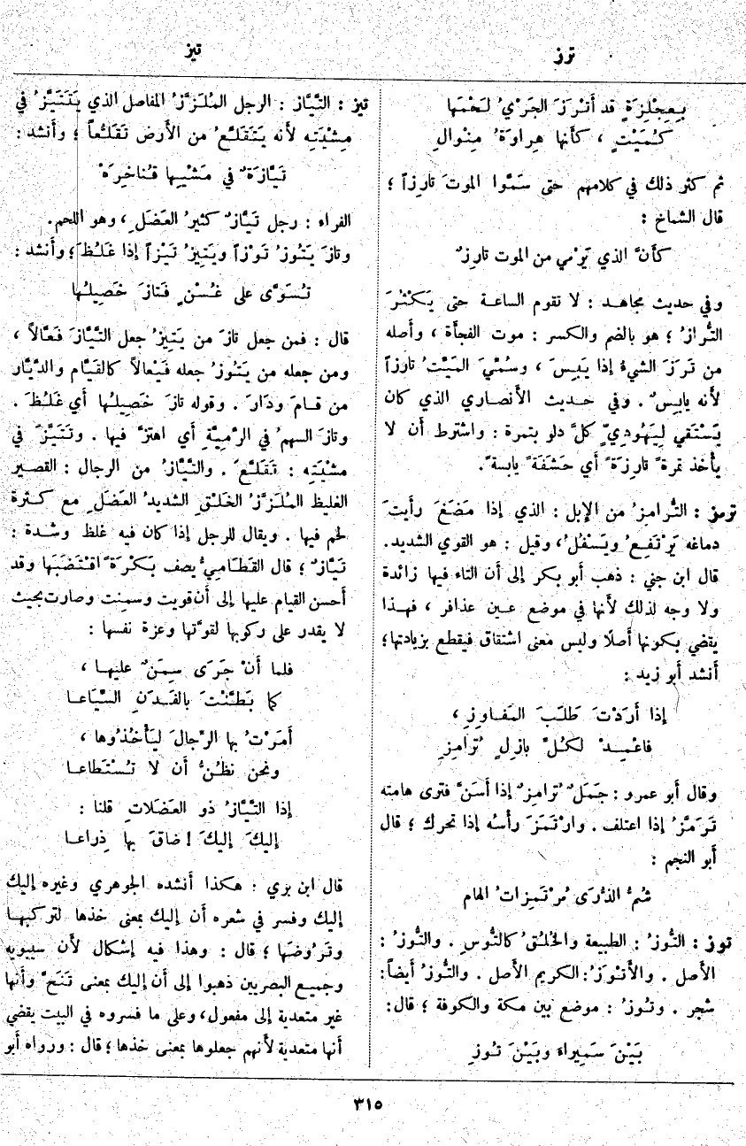 قَالَ: فَمَنْ جَعَلَ تازَ مِنْ يَتِيزُ جَعَلَ التَّيَّازَ فَعَّالًا، وَمَنْ جَعَلَهُ مِنْ يَتُوزُ جَعَلَهُ فَيْعالًا كالقَيَّام والدَّيَّار مِنْ قامَ ودَارَ. وَقَوْلُهُ تازَ خَصِيلُها أَي غَلُظَ. وتازَ السَّهْمُ فِي الرَّمِيَّةِ أَي اهتزَّ فِيهَا. وتَتَيَّزَ فِي مشْيَتِه: تَقَلَّعَ. والتَّيَّازُ مِنَ الرِّجَالِ: الْقَصِيرُ الْغَلِيظُ المُلَزَّزُ الخَلْقِ الشديدُ العَضَلِ مَعَ كَثْرَةِ لَحْمٍ فِيهَا. وَيُقَالُ لِلرَّجُلِ إِذا كَانَ فِيهِ غِلَظٌ وَشِدَّةٌ: تَيَّازٌ؛ قَالَ القَطَامِيُّ يَصِفُ بَكْرَةً اقْتَضَبَهَا وَقَدْ أَحسن الْقِيَامَ عَلَيْهَا إِلى أَن قَوِيَتْ وسمِنت وَصَارَتْ بِحَيْثُ لَا يَقْدِرُ عَلَى رُكُوبِهَا لقوَّتها وَعِزَّةِ نَفْسِهَا: