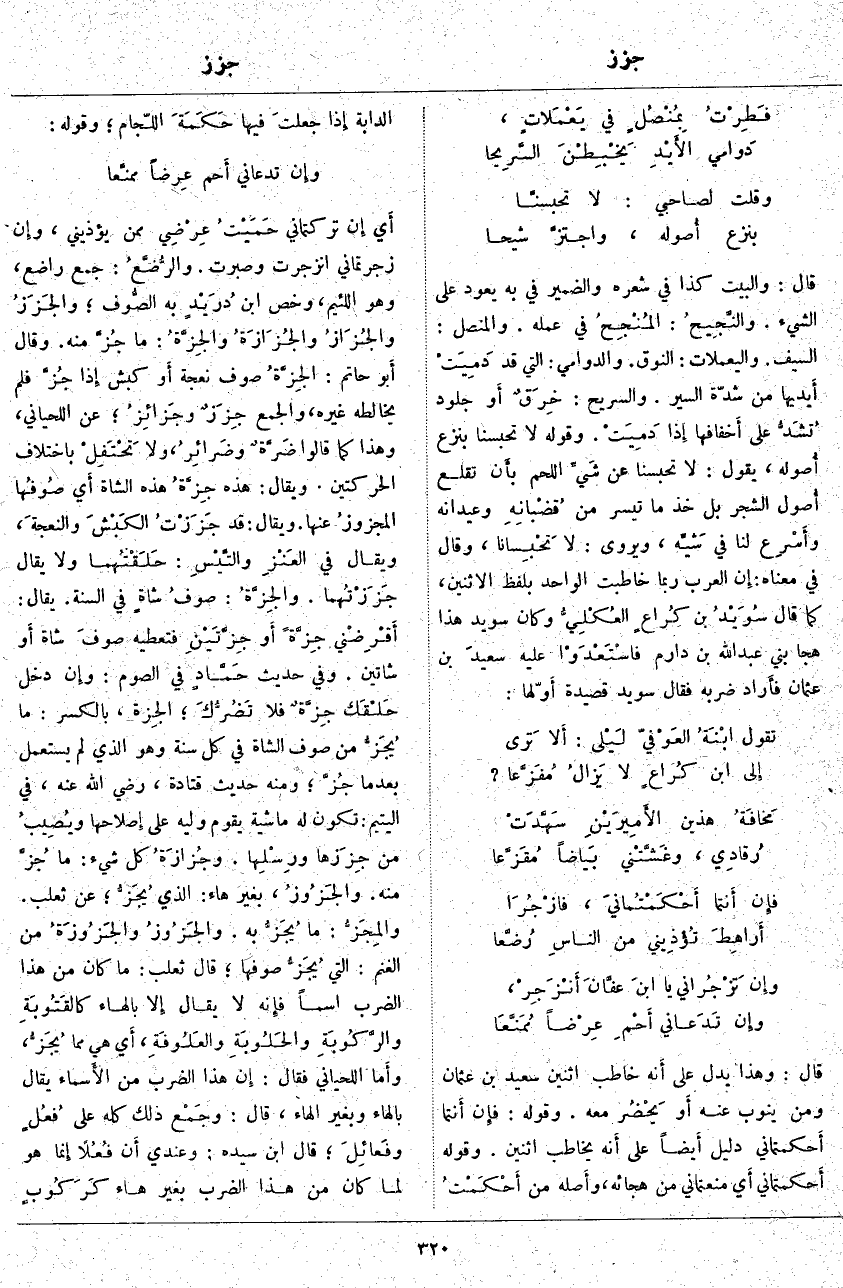قَالَ: وَالْبَيْتُ كَذَا فِي شِعْرِهِ وَالضَّمِيرُ فِي بِهِ يَعُودُ عَلَى الشَّيْءِ. والنَّجِيحُ: المُنْجِحُ فِي عَمَلِهِ. وَالْمُنَصَّلُ: السَّيْفُ. وَالْيَعْمَلَاتُ: النُّوقُ. وَالدَّوَامِي: الَّتِي قَدْ دَمِيَتْ أَيديها مِنْ شِدَّةِ السَّيْرِ. وَالسَّرِيحُ: خِرَقٌ أَو جُلُودٌ تُشَدُّ عَلَى أَخفافها إِذا دَمِيَتْ. وَقَوْلُهُ لَا تَحْبِسَنَّا بِنَزْعِ أُصوله، يَقُولُ: لَا تَحْبِسَنَّا عَنْ شَيِّ اللَّحْمِ بأَن تَقْلَعَ أُصول الشَّجَرِ بَلْ خُذْ مَا تَيَسَّرَ مِنْ قُضْبانِهِ وَعِيدَانِهِ وأَسْرِع لَنَا فِي شَيِّه، وَيُرْوَى: لَا تَحْبِسانا، وَقَالَ فِي مَعْنَاهُ: إِن الْعَرَبَ رُبَّمَا خَاطَبَتِ الْوَاحِدَ بِلَفْظِ الِاثْنَيْنِ، كَمَا قَالَ سُوَيْدُ بْنُ كُراعٍ العُكْلِيُّ وَكَانَ سُوَيْدٌ هَذَا هَجَا بَنِي عَبْدِ اللَّهِ بْنِ دَارِمٍ فاسْتَعْدَوْا عَلَيْهِ سعيدَ بْنَ عُثْمَانَ فأَراد ضَرْبَهُ فَقَالَ سُوَيْدٌ قَصِيدَةً أَوّلها: