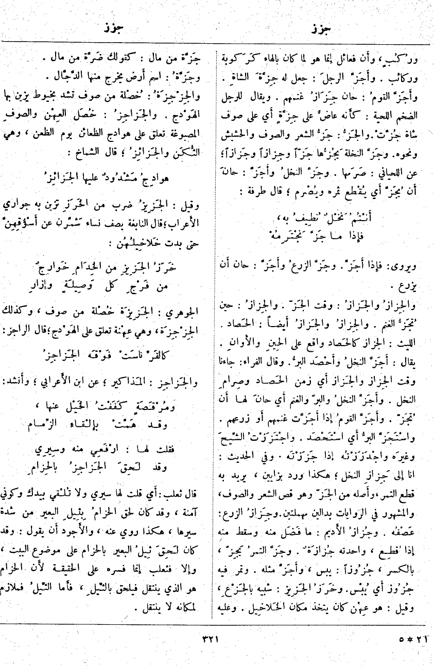 ؛ هَكَذَا وَرَدَ بِزَايَيْنِ، يُرِيدُ بِهِ قَطْعَ التَّمْرِ، وأَصله مِنَ الجَزّ وَهُوَ قَصُّ الشَّعْرِ وَالصُّوفِ، وَالْمَشْهُورُ فِي الرِّوَايَاتِ بِدَالَيْنِ مُهْمَلَتَيْنِ. وجِزَازُ الزَّرْعِ: عَصْفُه. وجُزازُ الأَديم: مَا فَضَل مِنْهُ وَسَقَطَ مِنْهُ إِذا قُطِع، وَاحِدَتُهُ جُزازَةٌ. وجَزَّ التمرُ يَجِزّ، بِالْكَسْرِ، جُزُوزاً: يَبِسَ، وأَجَزَّ مِثْلُهُ. وَتَمْرٌ فِيهِ جُزُوز أَي يُبْس. وخَرَزُ الجَزِيز: شَبِيهٌ بالجَزْعِ، وَقِيلَ: هُوَ عِهْن كَانَ يُتَّخَذُ مَكَانَ الخَلاخِيل. وَعَلَيْهِ جَزَّة مِنْ مَالٍ: كَقَوْلِكَ ضَرَّة مِنْ مَالٍ. وجَزَّةُ: اسْمُ أَرض يَخْرُجُ مِنْهَا الدَّجَّال. والجِزْجِزَةُ: خُصْلة مِنْ صُوفٍ تُشَدُّ بِخُيُوطٍ يُزَيَّنُ بِهَا الهَوْدج. والجَزاجِزُ: خُصَل العِهْن والصوفِ الْمَصْبُوغَةِ تُعَلَّقُ عَلَى هَوَادِجِ الظَّعَائِنِ يَوْمَ الظَّعْنِ، وَهِيَ الثُّكَن والجَزائِزُ؛ قَالَ الشَّمَّاخُ: