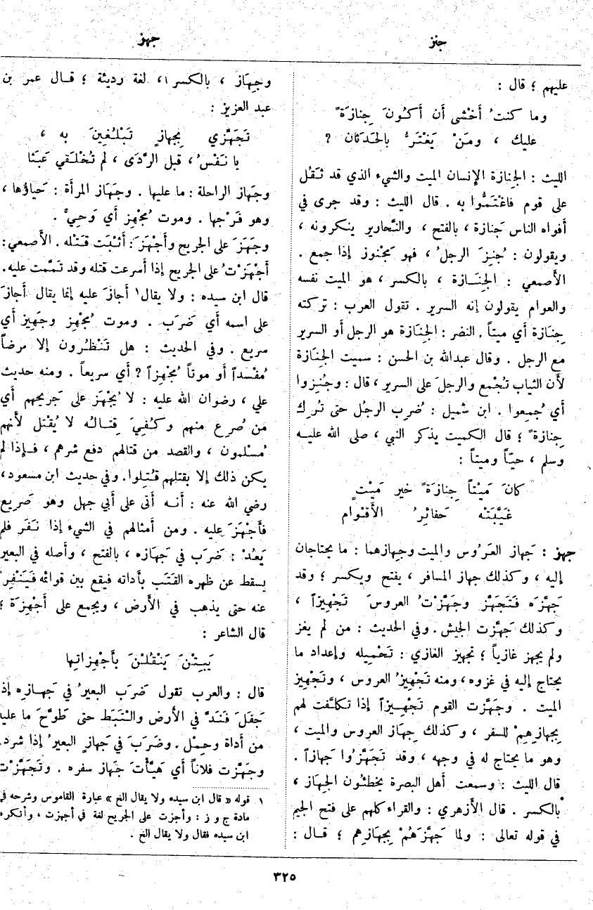 ؛ قَالَ: وجِهَاز، بِالْكَسْرِ، لُغَةٌ رَدِيئَةٌ؛ قَالَ عُمَرَ بْنِ عَبْدِ الْعَزِيزِ: