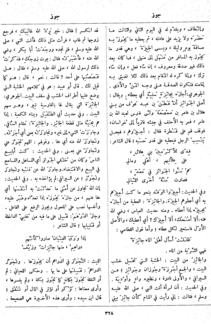 فَهِيَ الشَّرْبة مِنَ الْمَاءِ. والجائزُ مِنَ الْبَيْتِ: الْخَشَبَةُ الَّتِي تَحْمِل خَشَبَ الْبَيْتِ، وَالْجَمْعُ أَجْوِزَةٌ وجُوزان وجَوائِز؛ عَنِ السِّيرَافِيِّ، والأُولى نَادِرَةٌ، وَنَظِيرُهُ وادٍ وأَوْدِيَة. وَفِي الْحَدِيثِ: