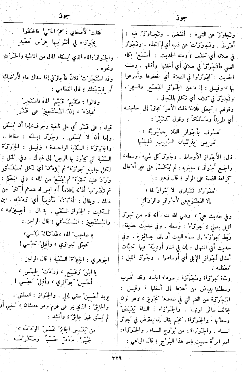 والجَوازُ: الْمَاءُ الَّذِي يُسْقاه الْمَالُ مِنَ الْمَاشِيَةِ والحَرْث وَنَحْوِهِ. وَقَدِ اسْتَجَزْتُ فُلَانًا فأَجازَني إِذا سَقَاكَ مَاءً لأَرْضِك أَو لِماشِيَتك؛ قَالَ الْقُطَامِيُّ: