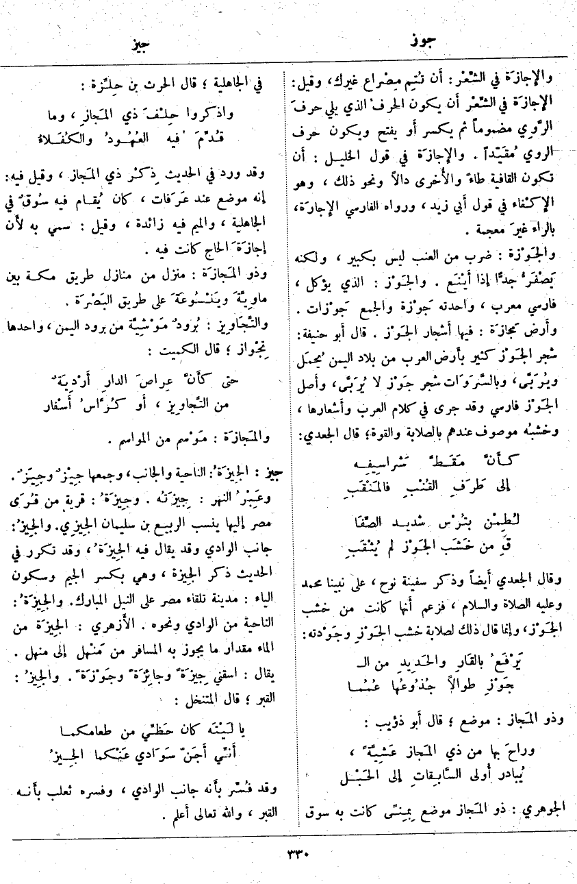 والإِجازَة فِي الشِّعْر: أَن تُتِم مِصْراع غَيْرِكَ، وَقِيلَ: الإِجازَة فِي الشِّعْر أَن يَكُونَ الحرفُ الَّذِي يَلِي حرفَ الرَّوِي مَضْمُومًا ثُمَّ يُكْسَرُ أَو يُفْتَحُ وَيَكُونُ حَرْفُ الرَّوِيِّ مُقَيّداً. والإِجازَة فِي قَوْلِ الْخَلِيلِ: أَن تَكُونَ الْقَافِيَةُ طَاءً والأُخرى دَالًا وَنَحْوُ ذَلِكَ، وَهُوَ الإِكْفاء فِي قَوْلِ أَبي زَيْدٍ، وَرَوَاهُ الْفَارِسِيُّ الإِجارَة، بِالرَّاءِ غيرَ مُعْجَمَةٍ. والجَوْزة: ضَرْبٌ مِنِ الْعِنَبِ لَيْسَ بِكَبِيرٍ، وَلَكِنَّهُ يَصْفَرُّ جِدًّا إِذا أَيْنَع. والجَوْز: الَّذِي يُؤْكَلُ، فَارِسِيٌّ مُعَرَّبٌ، وَاحِدَتُهُ جَوْزة وَالْجَمْعُ جَوْزات. وأَرض مجَازَة: فِيهَا أَشجار الجَوزْ. قَالَ أَبو حَنِيفَةَ: شَجَرُ الجَوْز كَثِيرٌ بأَرض الْعَرَبِ مِنْ بِلَادِ الْيَمَنِ يُحمَل ويُرَبَّى، وبالسَّرَوَات شَجَرُ جَوْز لَا يُرَبَّى، وأَصل الجَوْز فَارِسِيٌّ وَقَدْ جَرَى فِي كَلَامِ الْعَرَبِ وأَشعارها، وخشبُه مَوْصُوفٌ عِنْدَهُمْ بِالصَّلَابَةِ وَالْقُوَّةِ؛ قَالَ الْجَعْدِيُّ: