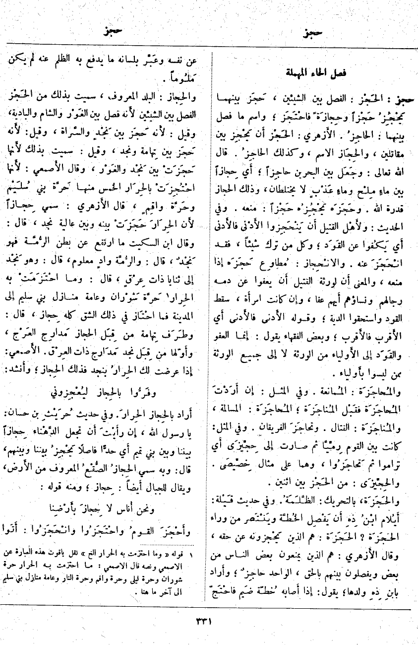 الحَجَزَة: هُمُ الَّذِينَ يَحْجزونه عَنْ حَقِّهِ، وَقَالَ الأَزهري: هُمُ الَّذِينَ يَمْنَعُونَ بَعْضَ النَّاسِ مِنْ بَعْضٍ وَيَفْصِلُونَ بَيْنَهُمْ بِالْحَقِّ، الْوَاحِدُ حاجِزٌ؛ وأَراد بابنِ ذِهِ وَلَدَهَا؛ يَقُولُ: إِذا أَصابه خُطّة ضَيم فاحْتَجّ عَنْ نَفْسِهِ وعَبَّر بِلِسَانِهِ مَا يَدْفَعُ بِهِ الظُّلْمَ عَنْهُ لَمْ يَكُنْ مَلُوماً. والحِجاز: الْبَلَدُ الْمَعْرُوفُ، سُمِّيَتْ بِذَلِكَ مِنَ الحَجْز الْفَصْلِ بَيْنَ الشَّيْئَيْنِ لأَنه فَصَلَ بَيْنَ الغَوْر وَالشَّامِ وَالْبَادِيَةِ، وَقِيلَ: لأَنه حَجَز بَيْنَ نَجْدٍ والسَّراة، وَقِيلَ: لأَنه حَجَز بَيْنَ تِهامة وَنَجْدٍ، وَقِيلَ: سُمِّيَتْ بِذَلِكَ لأَنها حَجَزَتْ بَيْنَ نَجْد والغَوْر، وَقَالَ الأَصمعي: لأَنها احْتُجِزَتْ بالحِرَار الْخَمْسِ مِنْهَا حَرَّة بَنِي سُلَيْم وحَرَّة واقِمٍ، قَالَ الأَزهري: سُمِّيَ حِجازاً لأَن الحِرَارَ حَجَزَتْ بَيْنَهُ وَبَيْنَ عَالِيَةِ نَجْدٍ، قَالَ: وَقَالَ ابْنُ السِّكِّيتِ مَا ارْتَفَعَ عَنْ بَطْنِ الرُّمَّة فَهُوَ نَجْدٌ، قَالَ: والرُّمَّة وادٍ مَعْلُومٌ، قَالَ: وَهُوَ نَجْد إِلى ثَنَايَا ذَاتِ عِرْقٍ، قَالَ: وَمَا احْتَزَمَتْ بِهِ الحِرار «2» حَرَّةَ شَوْران وَعَامَّةَ مَنَازِلِ بَنِي سُلَيْمٍ إِلى الْمَدِينَةِ فَمَا احْتَاز فِي ذَلِكَ الشِّقِّ كُلِّهِ حِجاز، قَالَ: وطَرَف تِهامة مِنْ قِبَل الْحِجَازِ مَدارِج العَرْج، وأَوّلها مِنْ قِبَل نَجْدٍ مَدَارج ذَاتِ العِرْق. الأَصمعي: إِذا عَرَضَتْ لَكَ الحِرارُ بِنَجْدٍ فَذَلِكَ الحِجاز؛ وأَنشد: