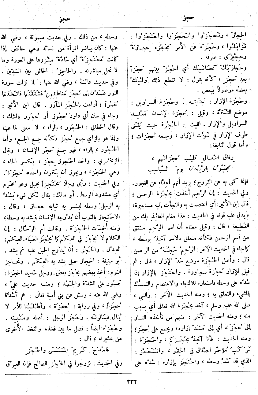 الحِجازَ، وتَحاجَزُوا وانْحَجَزُوا واحْتَجَزُوا: تَزايَلُوا، وحَجَزَه عَنِ الأَمر يَحْجُزه حِجازَةً وحِجِّيزَى: صَرَفَهُ. وحَجازَيْكُ كحَنانَيْك أَي احْجُزْ بَيْنَهُمْ حَجْزاً بَعْدَ حَجْزٍ، كأَنه يَقُولُ: لَا تَقْطَعُ ذَلِكَ وَلْيَكُ بعضُه مَوْصُولًا بِبَعْضٍ. وحُجْزة الإِزار: جَنَبته. وحُجْزة السَّرَاوِيلِ: مَوْضِعُ التِّكَّة، وَقِيلَ: حُجْزة الإِنسان مَعْقِد السَّرَاوِيلِ والإِزار. اللَّيْثُ: الحُجْزة حَيْثُ يُثْنى طَرَفُ الإِزار فِي لَوْث الإِزار، وَجَمْعُهُ حُجُزات؛ وأَما قَوْلُ النَّابِغَةِ: