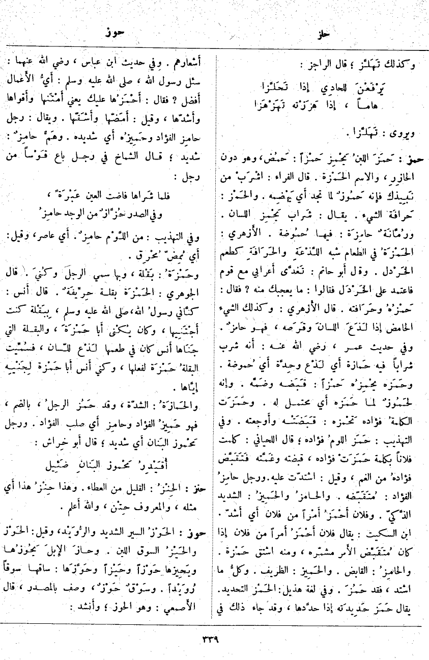 حمز: حَمَزَ اللبنُ يَحْمِز حَمْزاً: حَمُض، وَهُوَ دُونَ الحازِرِ، وَالِاسْمُ الحَمْزة. قَالَ الْفَرَّاءُ: اشْرَبْ مِنْ نَبِيذك فإِنه حَمُوزٌ لِمَا تَجِدُ أَي يَهْضِمه. والحَمْز: حَرافَة الشَّيْءِ. يُقَالُ: شَراب يَحْمِز اللِّسَانَ. ورُمَّانَةٌ حامِزَة: فِيهَا حُمُوضة. الأَزهري: الحَمْزَةُ فِي الطَّعَامِ شِبْهُ اللَّذْعَةِ والحَرَافَةِ كَطَعْمِ الخَرْدل. وَقَالَ أَبو حَاتِمٍ: تَغَدَّى أَعرابي مَعَ قَوْمٍ فَاعْتَمَدَ عَلَى الخَرْدَل فَقَالُوا: مَا يُعْجِبُكَ مِنْهُ؟ فَقَالَ: حَمْزُهُ وحَرَافته. قَالَ الأَزهري: وَكَذَلِكَ الشَّيْءُ الْحَامِضُ إِذا لَذَعَ اللسانَ وقَرَصه، فَهُوَ حامزٌ. وَفِي حَدِيثِ