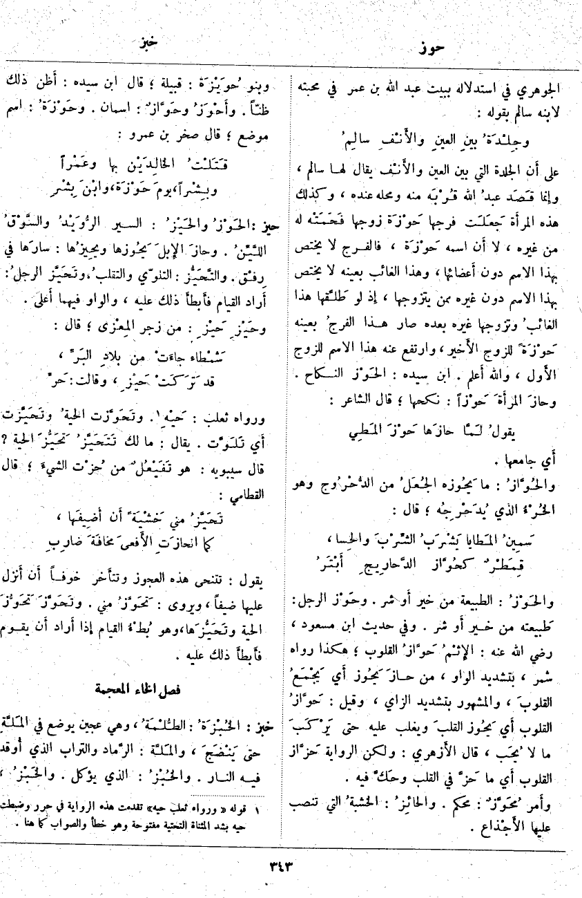 عَلَى أَن الْجِلْدَةَ الَّتِي بَيْنَ الْعَيْنِ والأَنْف يُقَالُ لَهَا سَالِمٌ، وإِنما قَصَد عبدُ اللَّهِ قُرْبَه مِنْهُ وَمَحَلَّهُ عِنْدَهُ، وَكَذَلِكَ هَذِهِ المرأَة جَعَلَت فَرْجَهَا حَوْزَة زَوْجِهَا فَحَمَتْه لَهُ مِنْ غَيْرِهِ، لَا أَن اسْمَهُ حَوْزَة، فَالْفَرْجُ لَا يَخْتَصُّ بِهَذَا الِاسْمِ دُونَ أَعضائها، وَهَذَا الْغَائِبُ بِعَيْنِهِ لَا يَخْتَصُّ بِهَذَا الِاسْمِ دُونَ غَيْرِهِ مِمَّنْ يَتَزَوَّجُهَا، إِذ لَوْ طَلَّقها هَذَا الغائبُ وَتَزَوَّجَهَا غَيْرُهُ بَعْدَهُ صَارَ هَذَا الفرجُ بِعَيْنِهِ حَوْزَةً لِلزَّوْجِ الأَخير، وَارْتَفَعَ عَنْهُ هَذَا الِاسْمُ لِلزَّوْجِ الأَول، وَاللَّهُ أَعلم. ابْنُ سِيدَهْ: الحَوْز النِّكَاحُ. وحازَ المرأَةَ حَوْزاً: نَكَحَهَا؛ قَالَ الشَّاعِرُ: