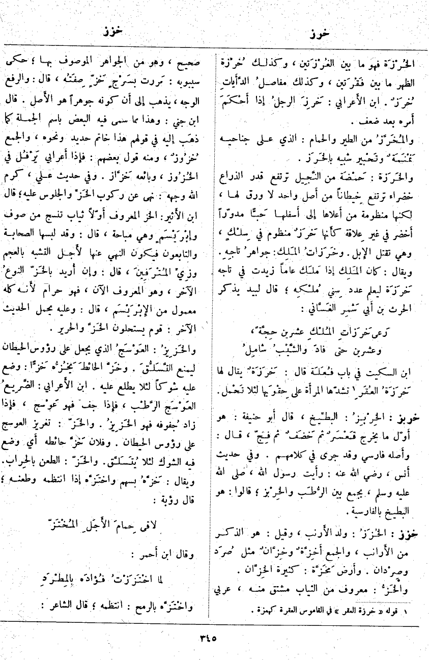 خزز: الخُزَزُ: وَلَدُ الأَرنب، وَقِيلَ: هُوَ الذَّكَرُ مِنَ الأَرانب، وَالْجَمْعُ أَخِزَّةٌ وخِزَّانٌ مِثْلَ صُرَد وصِرْدان. وأَرض مَخَزَّة: كَثِيرَةُ الخِزَّان. والخَزُّ: مَعْرُوفٌ مِنَ الثِّيَابِ مُشْتَقٌّ مِنْهُ، عَرَبِيٌّ صَحِيحٌ، وَهُوَ مِنَ الْجَوَاهِرِ الْمَوْصُوفِ بِهَا؛ حَكَى سِيبَوَيْهِ: مَررت بسَرْجٍ خَزٍّ صِفَتُه، قَالَ: وَالرَّفْعُ الْوَجْهُ، يَذْهَبُ إِلى أَن كَوْنَهُ جَوْهَرًا هُوَ الأَصل. قَالَ ابْنُ جِنِّي: وَهَذَا مِمَّا سَمَّى فِيهِ الْبَعْضُ بِاسْمِ الْجُمْلَةِ كَمَا ذهَب إِليه فِي قَوْلِهِمْ هَذَا خَاتَمُ حَدِيدٍ وَنَحْوِهِ، وَالْجَمْعُ خُزُوزٌ، وَمِنْهُ قَوْلُ بَعْضِهِمْ: فإِذا أَعرابي يَرْفُل فِي الخُزُوز، وَبَائِعُهُ خَزَّاز. وَفِي حَدِيثِ