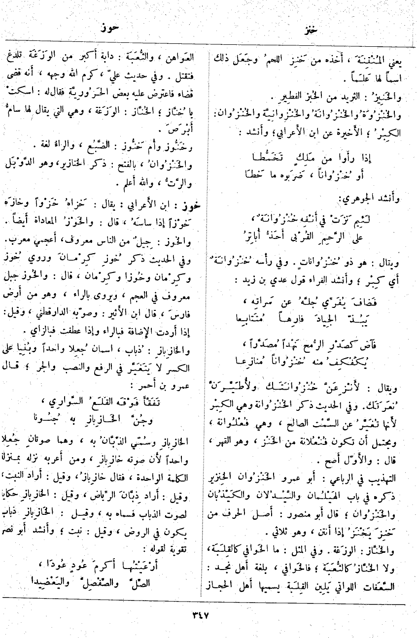 خوز: ابْنُ الأَعرابي: يُقَالُ: خَزاهُ خَزْواً وخازَه خَوْزاً إِذا ساسَهُ، قَالَ: والخَوْزُ الْمُعَادَاةُ أَيضاً. وَالْخَوْزُ: جِيلٌ مِنَ النَّاسِ مَعْرُوفٌ، أَعجمي مُعَرَّبٌ. وَفِي الْحَدِيثِ ذِكْرُ خُوزِ كِرْمانَ وَرُوِيَ خُوز وكِرْمان وخُوزا وكِرْمان، قَالَ: والخُوز جبل معروف في الْعَجَمِ، وَيُرْوَى بِالرَّاءِ، وَهُوَ مِنْ أَرض فَارِسَ، قَالَ ابْنُ الأَثير: وَصَوَّبَهُ الدَّارَقُطْنِيُّ، وَقِيلَ: إِذا أَردت الإِضافة فَبِالرَّاءِ وإِذا عَطَفْتَ فَبِالزَّايِ. والخازِبازِ: ذُباب، اسْمَانِ جُعِلا وَاحِدًا وبُنِيا عَلَى الْكَسْرِ لَا يَتَغَيَّر فِي الرَّفْعِ وَالنَّصْبِ وَالْجَرِّ؛ قَالَ عَمْرُو بْنُ أَحمر: