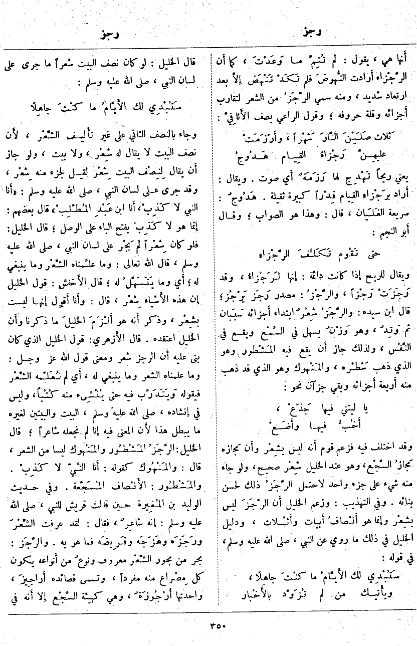 الْوَلِيدِ بْنِ المُغِيرة حِينَ قالت قُرَيْشٍ لِلنَّبِيِّ، صَلَّى اللَّه عَلَيْهِ وسلم: إِنه شاعِرٌ، فَقَالَ: لَقَدْ عَرَفْتُ الشِّعْرَ ورَجَزَه وهَزَجَه وقَرِيضَه فَمَا هُوَ بِهِ.