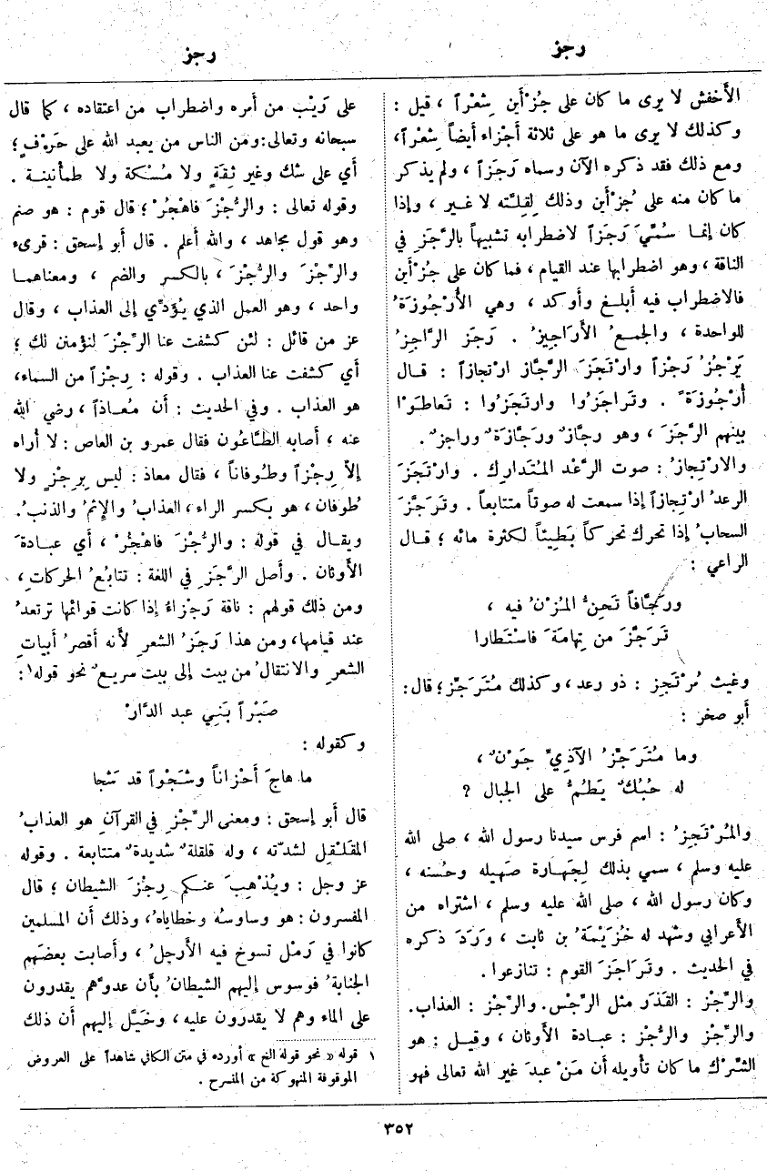 ، أَي عبادةَ الأَوثان. وأَصل الرَّجَزِ فِي اللُّغَةِ: تَتَابُعُ الحركاتِ، وَمِنْ ذَلِكَ قَوْلُهُمْ: نَاقَةٌ رَجْزاءُ إِذَا كَانَتْ قَوَائِمُهَا ترتعدُ عِنْدَ قِيَامِهَا، وَمِنْ هَذَا رَجَزُ الشعرِ لأَنه أَقصرُ أَبياتِ الشعرِ والانتقالُ مِنْ بَيْتٍ إِلى بَيْتٍ سريعٌ نَحْوُ قَوْلِهِ: «4»