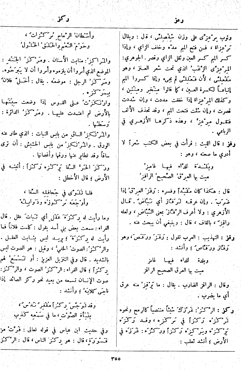 ركز: الرَّكْزُ: غَرْزُكَ شَيْئًا مُنْتَصِبًا كَالرُّمْحِ وَنَحْوِهِ تَرْكُزُه رَكْزاً فِي مَرْكَزِه، وَقَدْ رَكَزَه يَرْكُزُه ويَرْكِزُه رَكْزاً ورَكَّزَه: غَرَزَه فِي الأَرض؛ أَنشد ثَعْلَبٌ: