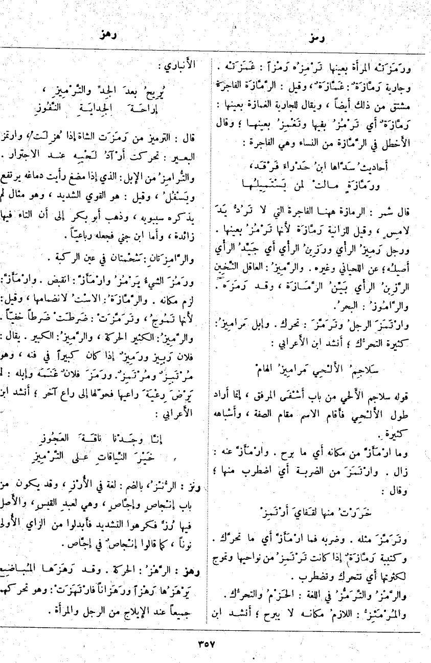 رهز: الرَّهْزُ: الْحَرَكَةُ. وَقَدْ رَهَزَها المُباضِع يَرْهَزُها رَهْزاً ورَهَزاناً فارْتَهَزَتْ: وَهُوَ تَحَرُّكُهُمَا جَمِيعًا عِنْدَ الإِيلاج مِنَ الرجل والمرأَة.
