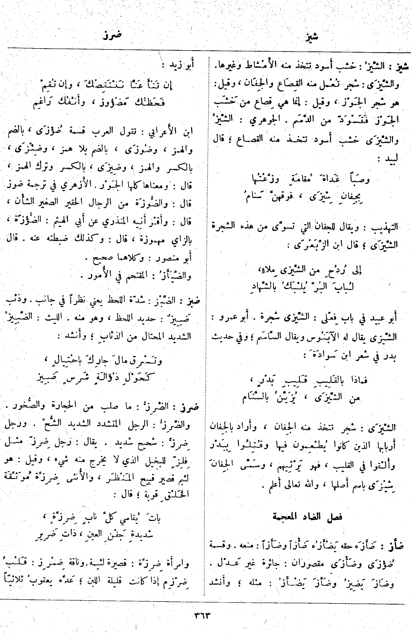 أَبو عُبَيْدٍ فِي بَابِ فِعْلى: الشِّيزى شَجَرَةٌ. أَبو عَمْرٍو: الشِّيزى يُقَالُ لَهُ الآبَنُوس وَيُقَالُ السَّاسَم؛ وَفِي حَدِيثِ بَدْرٍ فِي شِعْرِ ابْنِ سَوادَةَ: