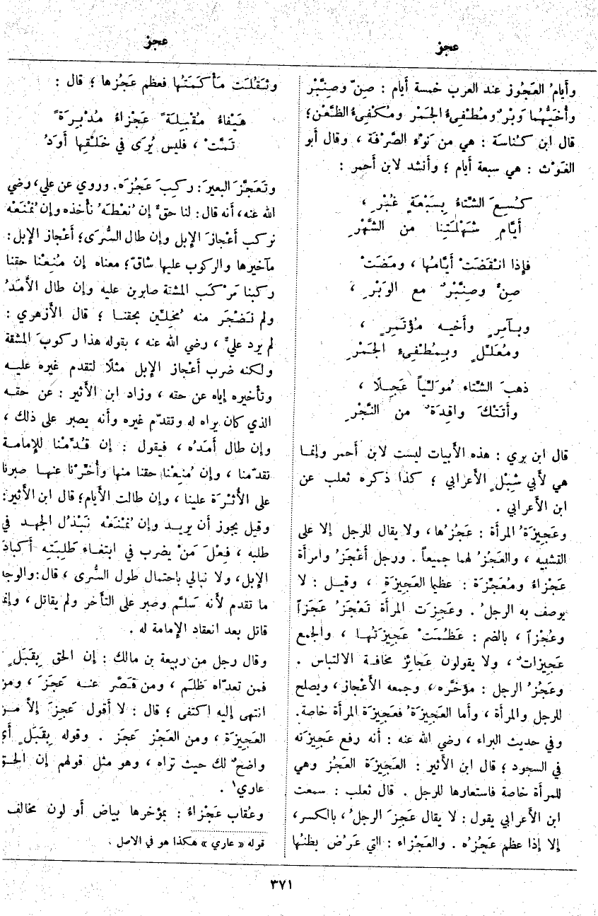 قَالَ ابْنُ بَرِّيٍّ: هَذِهِ الأَبيات لَيْسَتْ لِابْنِ أَحمر وإِنما هِيَ لأَبي شِبْلٍ الأَعرابي؛ كَذَا ذَكَرَهُ ثَعْلَبٌ عَنِ ابْنِ الأَعرابي. وعَجِيزَةُ المرأَة: عَجُزُها، وَلَا يُقَالُ لِلرَّجُلِ إِلا عَلَى التَّشْبِيهِ، والعَجُزُ لَهُمَا جَمِيعًا. وَرَجُلٌ أَعْجَزُ وامرأَة عَجْزاءُ ومُعَجِّزَة: عَظِيمَا العَجِيزَةِ، وَقِيلَ: لَا يُوصَفُ بِهِ الرجلُ. وعَجِزَت المرأَة تَعْجَزُ عَجَزاً وعُجْزاً، بِالضَّمِّ: عَظُمَتْ عَجِيزَتُها، وَالْجَمْعُ عَجِيزاتٌ، وَلَا يَقُولُونَ عَجائِز مَخَافَةَ الِالْتِبَاسِ. وعَجُزُ الرَّجُلِ: مؤَخَّره، وَجَمْعُهُ الأَعْجاز، وَيَصْلُحُ لِلرَّجُلِ والمرأَة، وأَما العَجِيزَةُ فعَجِيزَة المرأَة خَاصَّةً. وَفِي حَدِيثِ