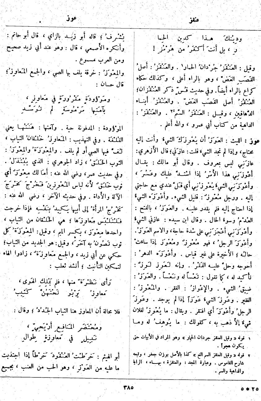عوز: اللَّيْثُ: العَوَزُ أَن يُعْوِزَكَ الشيءُ وأَنت إِليه مُحْتَاجٌ، وإِذا لَمْ تَجِدِ الشيءَ قُلْتَ: عازَني؛ قَالَ الأَزهري: عازَنِي لَيْسَ بِمَعْرُوفٍ. وَقَالَ أَبو مَالِكٍ: يُقَالُ أَعْوزَنِي هَذَا الأَمْرُ إِذا اشتدَّ عَلَيْكَ وعَسُرَ، وأَعْوَزَنِي الشيءُ يُعْوِزُنِي أَي قَلَّ عِنْدِي مَعَ حَاجَتِي إِليه. وَرَجُلٌ مُعْوِزٌ: قَلِيلُ الشَّيْءِ. وأَعْوَزَه الشيءُ إِذا احْتَاجَ إِليه فَلَمْ يَقْدِرْ عَلَيْهِ. والعَوَزُ، بِالْفَتْحِ: العُدْمُ وسوءُ الْحَالِ. وَقَالَ ابْنُ سِيدَهْ: عَازَنِي الشيءُ وأَعْوَزَنِي أَعْجَزَنِي عَلَى شِدَّةِ حَاجَةٍ، وَالِاسْمُ العَوَزُ. وأَعْوَزَ الرجلُ، فَهُوَ مُعْوِزٌ ومُعْوَز إِذا ساءَتْ حالُه؛ الأَخيرة عَلَى غَيْرِ قِيَاسٍ. وأَعْوَزَه الدهرُ: أَحوجه وحلَّ عَلَيْهِ الفَقْرُ. وإِنه لَعَوِز لَوِزٌ: تأْكيد لَهُ، كَمَا تَقُولُ: تَعْساً لَهُ ونَعْساً. والعَوَزُ: ضِيقُ الشَّيْءِ. والإِعْوازُ: الْفَقْرُ. والمُعْوِزُ: الْفَقِيرُ. وعَوِزَ الشيءُ عَوَزاً إِذا لَمْ يُوجَدْ. وعَوِزَ الرجلُ وأَعْوَزَ أَي افْتَقَرَ. وَيُقَالُ: مَا يُعْوِزُ لِفُلَانٍ شيءٌ إِلَّا ذَهَبَ بِهِ، كَقَوْلِكَ: مَا يُوهِفُ لَهُ وَمَا يُشْرِفُ؛ قَالَهُ أَبو زَيْدٍ بِالزَّايِ، قَالَ أَبو حَاتِمٍ: وأَنكره الأَصمعي، قَالَ: وَهُوَ عِنْدَ أَبي زَيْدٍ صَحِيحٌ وَمِنَ الْعَرَبِ مَسْمُوعٌ. والمِعْوَزُ: خِرْقَةٌ يُلَفُّ بِهَا الصَّبِيُّ، وَالْجَمْعُ المَعاوِزُ؛ قَالَ حَسَّانُ:
