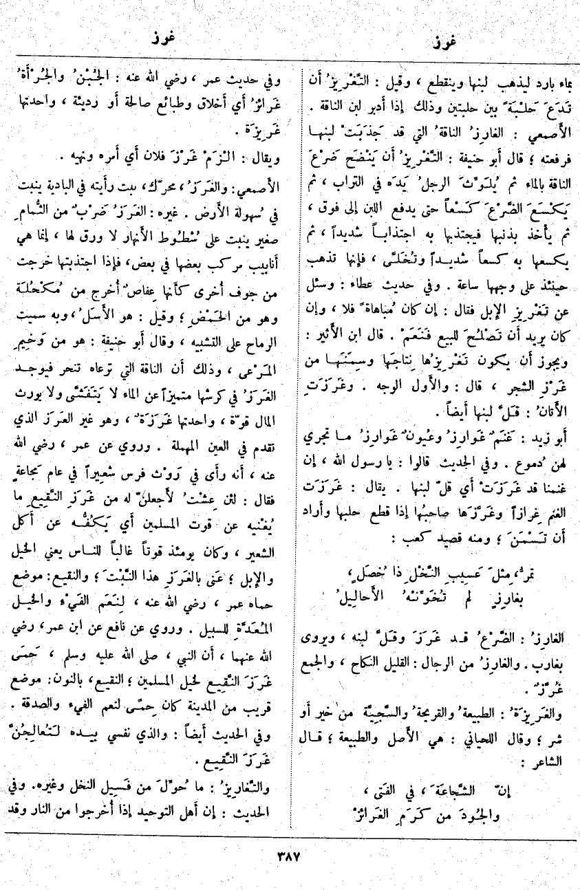 الغارِزُ: الضَّرْعُ قَدْ غَرَزَ وقَلَّ لَبَنُهُ، وَيُرْوَى بِغَارِبٍ. والغارِزُ مِنَ الرِّجَالِ: الْقَلِيلُ النِّكَاحِ، وَالْجَمْعُ غُرَّزٌ. والغَرِيزَةُ: الطبيعةُ والقريحةُ والسَّجِيَّة مِنْ خَيْرٍ أَو شَرٍّ؛ وَقَالَ اللِّحْيَانِيُّ: هِيَ الأَصل وَالطَّبِيعَةُ؛ قَالَ الشَّاعِرُ: