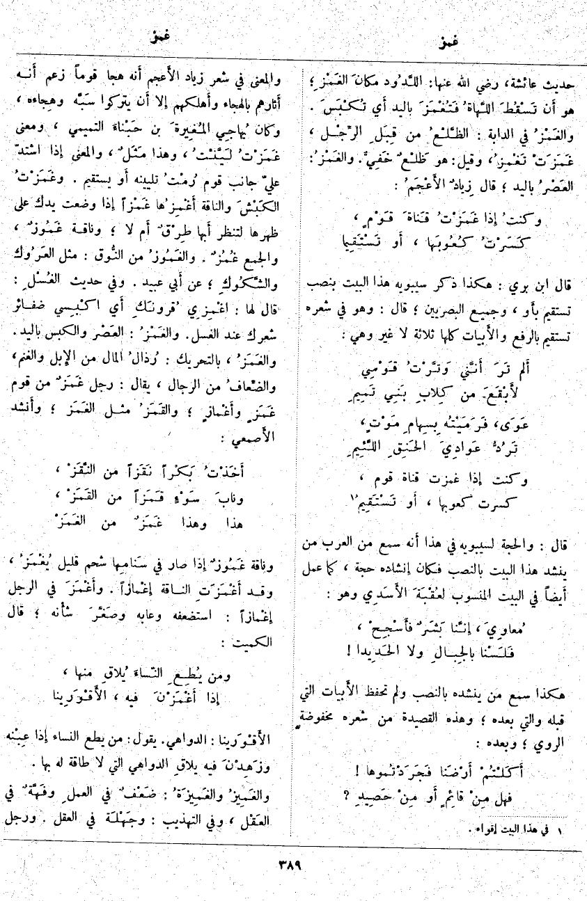 وَالْمَعْنَى فِي شِعْرِ زِيَادٍ الأَعجم أَنه هَجَا قَوْمًا زَعَمَ أَنه أَثارهم بِالْهِجَاءِ وأَهلكهم إِلا أَن يَتْرُكُوا سَبَّه وهِجاءه، وَكَانَ يُهاجِي المُغِيرةَ بْنُ حَبْناءَ التَّمِيمِيُّ، وَمَعْنَى غَمَزْتُ لَيَّنْتُ، وَهَذَا مَثَلٌ، وَالْمَعْنَى إِذا اشْتَدَّ عَلَيَّ جَانِبُ قَوْمٍ رُمْتُ تَلْيِينَهُ أَو يستقيم. وغَمَزْتُ الكَبْشَ والناقة أَغْمِزُها غَمْزاً إِذا وَضَعْتَ يَدَكَ عَلَى ظَهْرِهَا لِتَنْظُرَ أَبها طِرْقٌ أَم لَا؛ وَنَاقَةٌ غَمُوزٌ، وَالْجَمْعُ غُمُزٌ. والغَمُوزُ مِنَ النُّوق: مِثْلُ العَرُوك والشَّكُوكِ؛ عَنْ أَبي عُبَيْدٍ. وَفِي حَدِيثِ الغُسْلِ: