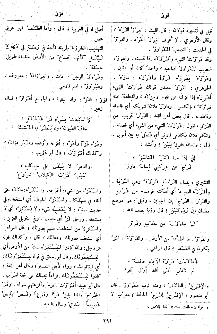 والإِفْرِيزُ: الطَّنْفُ، وَمِنْهُ ثَوْبٌ مَفْرُوزٌ. قَالَ أَبو مَنْصُورٍ: الإِفْرِيزُ إِفْرِيزُ الْحَائِطِ؛ مُعَرَّبٌ لَا أَصل لَهُ فِي الْعَرَبِيَّةِ؛ قَالَ: وأَما الطَّنْفُ فَهُوَ عَرَبِيٌّ مَحْضٌ. التَّهْذِيبُ: الفارِزَةُ طَرِيقَةٌ تأْخذ فِي رَمْلَةٍ فِي دَكادِكَ لَيِّنَةٍ كأَنها صَدْعٌ مِنَ الأَرض منقاد طويلٌ خِلْقَةً. وفَرْوَزَ الرجلُ: مَاتَ. والفِرْزانُ: مَعْرُوفٌ. وفَيْرُوزٌ: اسْمٌ فَارِسِيٌّ.