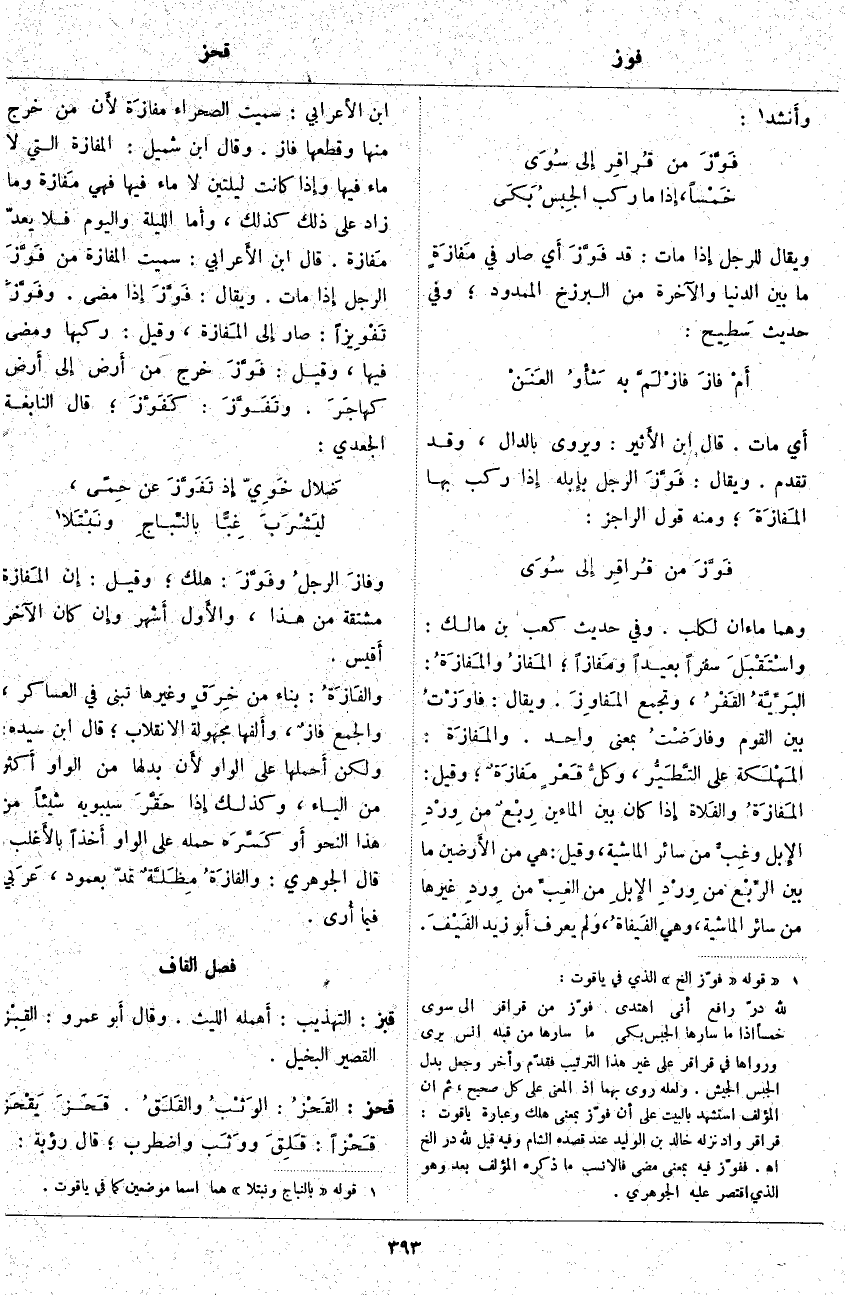 ورواها في قراقر على غير هذا الترتيب فقدّم وأخر وجعل بدل الجبس الجيش. ولعله روى بهما إذ المعنى على كل صحيح، ثم إن المؤلف استشهد بالبيت على أن فوّز بمعنى هلك وعبارة ياقوت: قراقر واد نزله خالد بن الوليد عند قصده الشام وفيه قيل لله در إلخ انتهى. ففوّز فيه بمعنى مضى فالأنسب ما ذكره المؤلف بعد وهو الذي اقتصر عليه الجوهري.