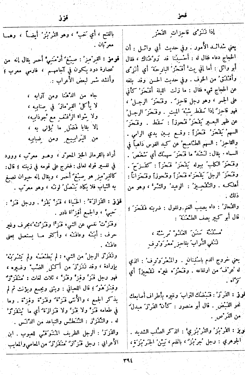 قرز: القَرْزُ: قَبْضُك الترابَ وَغَيْرَهُ بأَطراف أَصابعك نَحْوَ القَبْضِ. قَالَ أَبو مَنْصُورٍ: كأَنَّ القَرْزَ مبدلٌ مِنَ القَرْصِ.