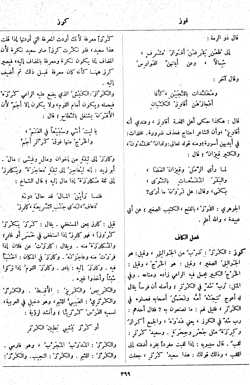 كرز: الكُرْزُ: ضَرْبٌ مِنَ الجُوالِقِ، وَقِيلَ: هُوَ الجُوالِقُ الصَّغِيرُ، وَقِيلَ: هُوَ الخُرْجُ، وَقِيلَ: الخُرْجُ الْكَبِيرُ يَحْمَلُ فِيهِ الرَّاعِي زَادَهُ وَمَتَاعَهُ. وَفِي الْمَثَلِ: رُبَّ شَدٍّ فِي الكُرْزِ؛ وأَصله أَن فَرَسًا يُقَالُ لَهُ أَعوج نُتِجَتْهُ أُمُّه وتَحَمَّلَ أَصحابه فَحَمَلُوهُ فِي الكُرْزِ، فَقِيلَ لَهُمْ: مَا تَصْنَعُونَ بِهِ؟ فَقَالَ أَحدهم: رُبَّ شَدٍّ فِي الْكُرْزِ، يَعْنِي عَدْوَهُ، وَالْجَمْعُ أَكرازٌ وكِرَزَةٌ مِثْلَ جُحْرٍ وجِحَرَةٍ. وسعيدُ كُرْزٍ: لقبٌ. قَالَ سِيبَوَيْهِ: إِذا لَقَّبْتَ مُفْرَدًا بِمُفْرَدٍ أَضفته إِلى اللَّقَبِ، وَذَلِكَ قَوْلُكَ: هَذَا سعيدُ كُرْزٍ، جَعَلَتْ كُرْزاً مُعَرَّفَةً لأَنك أَردت الْمَعْرِفَةَ الَّتِي أَردتها إِذا قُلْتَ هَذَا سَعِيدٌ، فَلَوْ نكَّرت كُرْزًا صَارَ سَعِيدٌ نَكِرَةً لأَن الْمُضَافَ إِنما يَكُونُ نَكِرَةً وَمَعْرِفَةً بِالْمُضَافِ إِليه، فَيَصِيرُ كُرْزٌ هَاهُنَا كأَنه كَانَ مَعْرِفَةً قَبْلَ ذَلِكَ ثُمَّ أُضيف إِليه. والكَرَّازُ: الكَبْشُ الَّذِي يَضَعُ عَلَيْهِ الرَّاعِي كُرْزَهُ فَيَحْمِلُهُ وَيَكُونُ أَمام الْقَوْمِ، وَلَا يَكُونُ إِلا أَجَمَّ لأَن الأَقْرَنَ يَشْتَغِلُ بالنِّطاحِ؛ قَالَ: