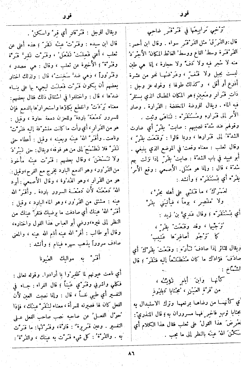أَي كأَنهما مِنْ رِضَاهُمَا بِمَرْتَعِهِمَا وَتَرْكِ الِاسْتِبْدَالِ بِهِ مُجتابا ثوبٍ فاخِرٍ فَهُمَا مَسْرُورَانِ بِهِ؛ قَالَ الْمُنْذِرِيُّ: فعُرِضَ هَذَا القولُ عَلَى ثَعْلَبٍ فَقَالَ هَذَا الْكَلَامُ أَي سَكَّنَ اللهُ عينَه بِالنَّظَرِ إِلى مَا يُحِبُّ. وَيُقَالُ لِلرَّجُلِ: قَرْقارِ أَي قِرَّ واسكنْ. قَالَ ابْنُ سِيدَهْ: وقَرَّتْ عينُه تَقَرّ؛ هَذِهِ أَعلى عَنْ ثَعْلَبٍ، أَعني فَعِلَتْ تَفْعَلُ، وقَرَّت تَقِرُّ قَرَّة وقُرَّةً؛ الأَخيرة عَنْ ثَعْلَبٍ، وَقَالَ: هِيَ مَصْدَرٌ، وقُرُوراً، وَهِيَ ضدُّ سَخِنتْ، قَالَ: وَلِذَلِكَ اخْتَارَ بَعْضُهُمْ أَن يَكُونَ قَرَّت فَعِلَت لِيَجِيءَ بِهَا عَلَى بِنَاءِ ضِدِّهَا، قَالَ: وَاخْتَلَفُوا فِي اشْتِقَاقِ ذَلِكَ فَقَالَ بَعْضُهُمْ: مَعْنَاهُ بَرَدَتْ وَانْقَطَعَ بُكَاؤُهَا واستحرارُها بِالدَّمْعِ فإِن لِلسُّرُورِ دَمْعَةً بَارِدَةً وَلِلْحُزْنِ دَمْعَةً حَارَّةً، وَقِيلَ: هُوَ مِنَ القَرارِ، أَي رأَت ما كانت متشوّقة إِليه فقَرَّتْ وَنَامَتْ. وأَقَرَّ اللهُ عينَه وَبِعَيْنِهِ، وَقِيلَ: أَعطاه حَتَّى تَقَرَّ فَلَا تَطْمَحَ إِلى مَنْ هُوَ فَوْقَهُ، وَيُقَالُ: حَتَّى تَبْرُدَ وَلَا تَسْخَنَ، وَقَالَ بَعْضُهُمْ: قَرَّت عينُه مأْخوذ مِنَ القَرُور، وَهُوَ الدَّمْعُ الْبَارِدُ يَخْرُجُ مَعَ الْفَرَحِ، وَقِيلَ: هُوَ مِنَ القَرارِ، وَهُوَ الهُدُوءُ، وَقَالَ الأَصمعي: أَبرد اللهُ دَمْعَتَه لأَن دَمْعَة السُّرُورِ بَارِدَةٌ. وأَقَرَّ اللَّهُ عَيْنَهُ: مُشْتَقٌّ مِنَ القَرُور، وَهُوَ الْمَاءُ الْبَارِدُ، وَقِيلَ: أَقَرَّ اللهُ عَيْنَكَ أَي صَادَفْتَ مَا يُرْضِيكَ فَتَقَرُّ عَيْنُكَ مِنَ النَّظَرِ إِلى غَيْرِهِ، وَرَضِيَ أَبو الْعَبَّاسِ هَذَا الْقَوْلَ وَاخْتَارَهُ، وَقَالَ أَبو طَالِبٍ: أَقرَّ اللَّهُ عَيْنَهُ أَنام اللَّهُ عَيْنَهُ، وَالْمَعْنَى صَادَفَ سُرُورًا يُذْهِبُ سَهَرَهُ فَيَنَامُ؛ وأَنشد: