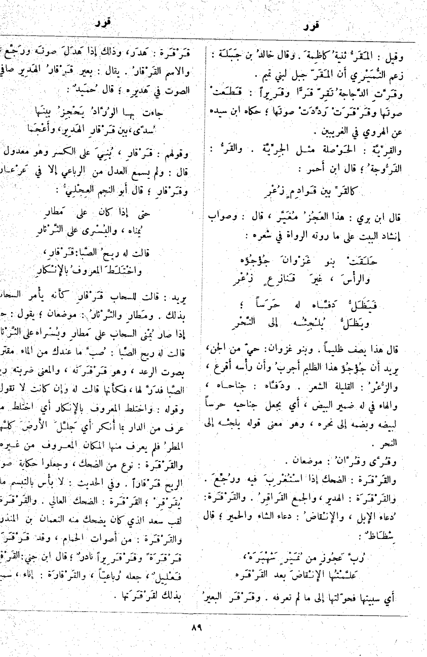 يريد: قالت لسحاب قَرْقارِ كأَنه يأْمر السَّحَابَ بِذَلِكَ. ومَطارِ والثَّرْثارُ: مَوْضِعَانِ؛ يَقُولُ: حَتَّى إِذا صَارَ يُمْنى السَّحَابِ عَلَى مَطارِ ويُسْراه عَلَى الثَّرْثارِ قَالَتْ لَهُ رِيحُ الصَّبا: صُبَّ مَا عِنْدَكَ مِنَ الْمَاءِ مُقْتَرِنًا بِصَوْتِ الرَّعْدِ، وَهُوَ قَرْقَرَته، وَالْمَعْنَى ضَرَبَتْهُ رِيحُ الصَّبا فدَرَّ لَهَا، فكأَنها قَالَتْ لَهُ وإِن كَانَتْ لَا تَقُولُ. وَقَوْلُهُ: وَاخْتَلَطَ الْمَعْرُوفُ بالإِنكار أَي اخْتَلَطَ مَا عُرِفَ مِنَ الدَّارِ بِمَا أُنكر أَي جَلَّلَ الأَرضَ كلَّها المطرُ فَلَمْ يُعْرَفْ مِنْهَا الْمَكَانُ الْمَعْرُوفُ مِنْ غَيْرِهِ. والقَرْقَرة: نَوْعٌ مِنَ الضَّحِكِ، وَجَعَلُوا حِكَايَةَ صَوْتِ الرِّيحِ قَرْقاراً. وَفِي الْحَدِيثِ: