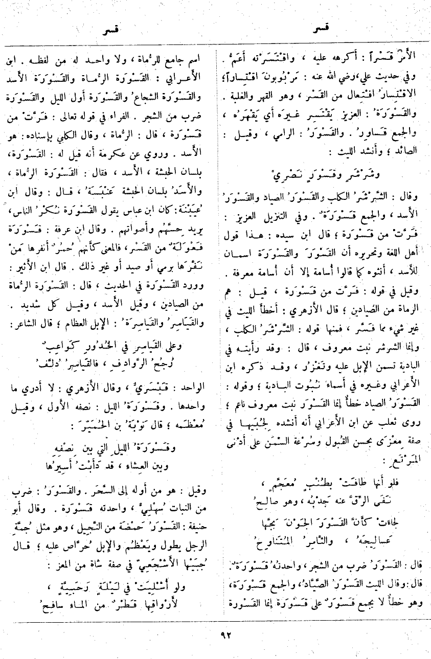 ، قَالَ: الرُّماة، وَقَالَ الْكَلْبِيُّ بإِسناده: هُوَ الأَسد. وَرُوِيَ عَنْ عِكْرِمَةَ أَنه قِيلَ لَهُ: القَسْوَرة، بِلِسَانِ الْحَبَشَةِ، الأَسد، فَقَالَ: القَسْوَرة الرُّماة، والأَسَدُ بِلِسَانِ الْحَبَشَةِ عَنْبَسَةُ، قَالَ: وَقَالَ ابْنُ عُيَيْنَة: كَانَ ابْنُ عَبَّاسٍ يَقُولُ القَسْوَرة نُكْرُ النَّاسِ، يُرِيدُ حِسَّهُم وأَصواتهم. وَقَالَ ابْنُ عَرَفَةَ: قَسْوَرَة فَعْوَلَةٌ مِنَ القَسْر، فَالْمَعْنَى كأَنهم حُمُرٌ أَنفرها مَنْ نَفَّرَها بِرَمْيٍ أَو صَيْدٍ أَو غَيْرُ ذَلِكَ. قَالَ ابْنُ الأَثير: وَوَرَدَ القَسْوَرة فِي الْحَدِيثِ، قَالَ: القَسْوَرة الرُّماة مِنَ الصَّيَّادِينَ، وَقِيلَ الأَسد، وَقِيلَ كُلُّ شَدِيدٍ. والقَيَاسِرُ والقَياسِرَةُ: الإِبل الْعِظَامُ؛ قَالَ الشَّاعِرُ: