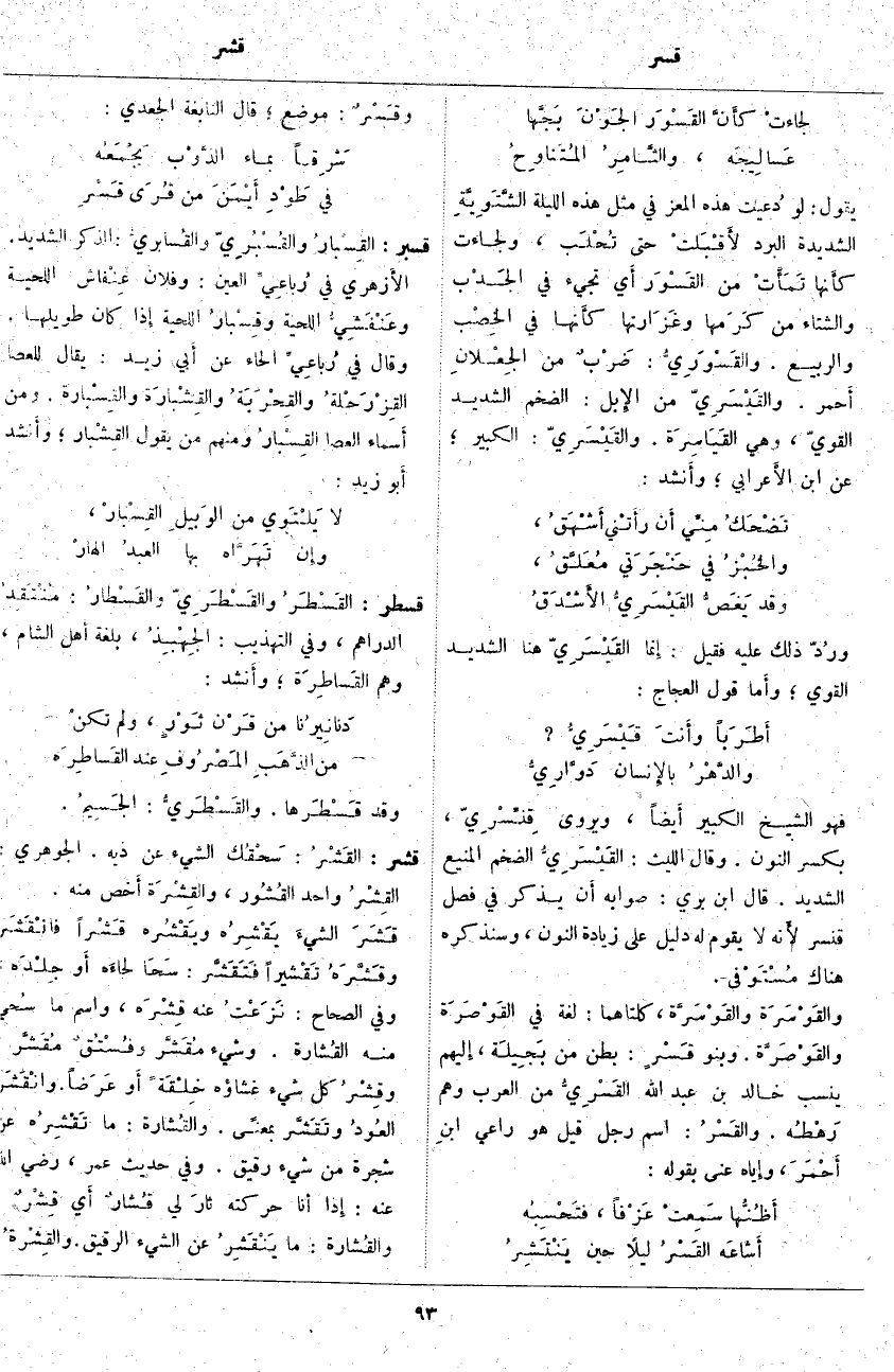 فَهُوَ الشَّيْخُ الْكَبِيرُ أَيضاً، وَيُرْوَى قِنِّسْرِيّ، بِكَسْرِ النُّونِ. وَقَالَ اللَّيْثُ: القَيْسَرِيُّ الضَّخْمُ الْمَنِيعُ الشَّدِيدُ. قَالَ ابْنُ بَرِّيٍّ: صَوَابُهُ أَن يُذْكَرَ فِي فَصْلِ قنسر لأَنه لَا يَقُومُ لَهُ دَلِيلٌ عَلَى زِيَادَةِ النُّونِ، وَسَنَذْكُرُهُ هناك مُسْتَوْفى. والقَوْسَرَة والقَوْسَرَّة، كِلْتَاهُمَا: لُغَةٌ فِي القَوْصَرَة والقَوْصَرَّة. وبنو قَسْرٍ: بَطْنٌ مِنْ بَجِيلَة، إِليهم يُنْسَبُ خَالِدِ بْنِ عَبْدِ اللَّهِ القَسْرِيُّ مِنَ الْعَرَبِ وَهُمْ رَهْطُه. والقَسْرُ: اسْمُ رَجُلٍ قِيلَ هُوَ رَاعِي ابنِ أَحْمَرَ، وإِياه عَنَى بِقَوْلِهِ: