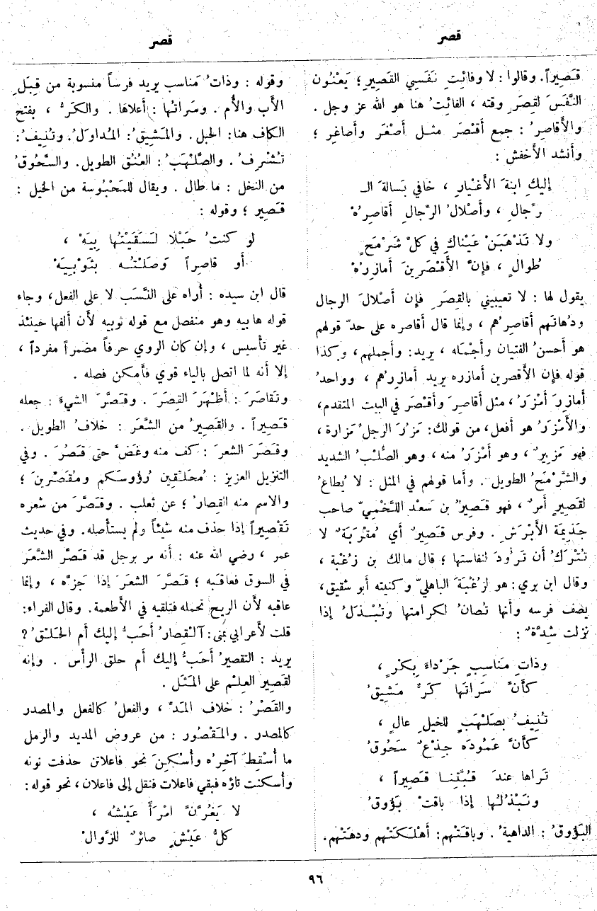 قَالَ ابْنُ سِيدَهْ: أُراه عَلَى النَّسَب لَا عَلَى الفعل، وجاء قوله هابيه وَهُوَ مُنْفَصِلٌ مَعَ قَوْلِهِ ثَوْبِيَهْ لأَن أَلفها حِينَئِذٍ غَيْرُ تأْسيس، وإِن كَانَ الرويُّ حَرْفًا مُضْمَرًا مُفْرَدًا، إِلا أَنه لَمَّا اتَّصَلَ بِالْيَاءِ قَوِيَ فأَمكن فَصْلُهُ. وتَقَاصَرَ: أَظْهَرَ القِصَرَ. وقَصَّرَ الشيءَ: جَعَلَهُ قَصِيراً. والقَصِيرُ مِنَ الشَّعَر: خلافُ الطَّوِيلِ. وقَصَرَ الشعرَ: كَفَّ مِنْهُ وغَضَّ حَتَّى قَصُرَ. وَفِي التنزيل العزيز: مُحَلِّقِينَ رُؤُسَكُمْ وَمُقَصِّرِينَ
