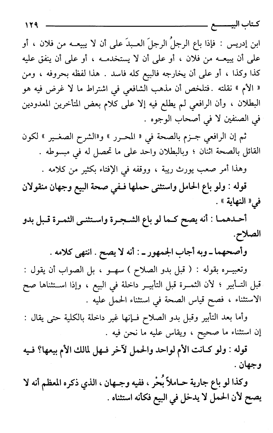 ابن إدريس: فإذا باع الرجلُ الرجلَ العبدَ على أن لا يبيعه من فلان، أو على أن يبيعه من فلان، أو على أن لا يستخدمه، أو على أن ينفق عليه كذا وكذا، أو على أن يخارجه فالبيع كله فاسد. هذا لفظه بحروفه، ومن "الأم" نقلته. فتلخص أن مذهب الشافعي في اشتراط ما لا غرض فيه هو البطلان، وأن الرافعي لم يطلع فيه إلا على كلام بعض المتأخرين المعدودين في الصنفين لا في أصحاب الوجوه.
