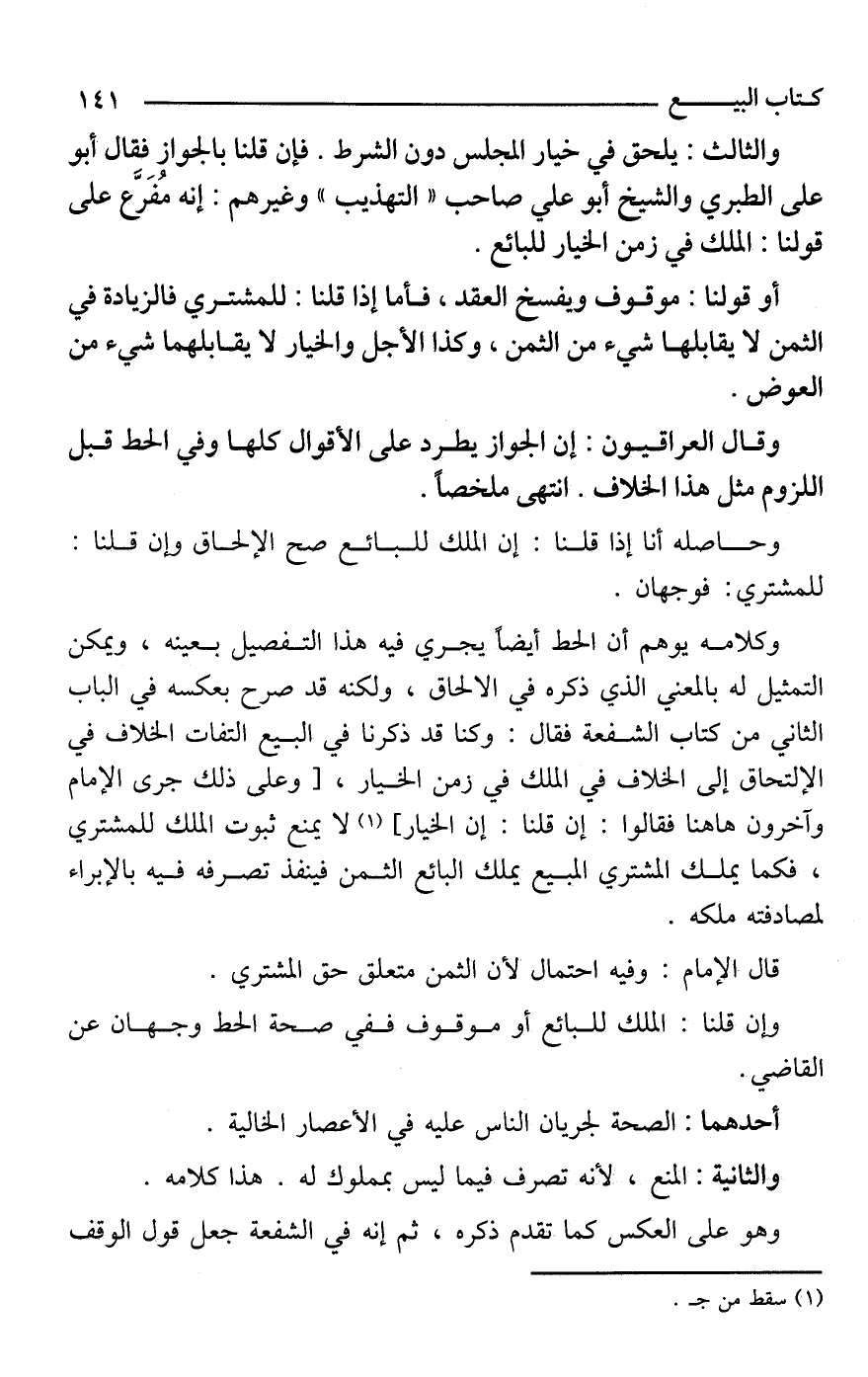 وكلامه يوهم أن الحط أيضًا يجري فيه هذا التفصيل بعينه، ويمكن التمثيل له بالمعني الذي ذكره في الالحاق، ولكنه قد صرح بعكسه في الباب الثاني من كتاب الشفعة فقال: وكنا قد ذكرنا في البيع التفات الخلاف في الإلتحاق إلى الخلاف في الملك في زمن الخيار، [وعلى ذلك جرى الإمام وآخرون هاهنا فقالوا: إن قلنا: إن الخيار] (¬1) لا يمنع ثبوت الملك للمشتري، فكما يملك المشتري المبيع يملك البائع الثمن فينفذ تصرفه فيه بالإبراء لمصادفته ملكه.