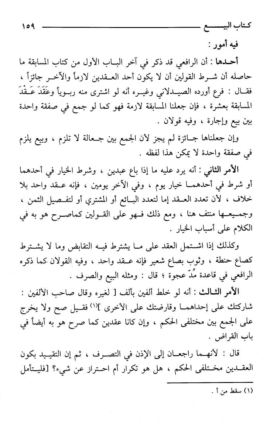 أحدها: أن الرافعي قد ذكر في آخر الباب الأول من كتاب المسابقة ما حاصله أن شرط القولين أن لا يكون أحد العقدين لازمًا والآخر جائزًا، فقال: فرع أورده الصيدلاني وغيره أنه لو اشترى منه ربويًا وعَقَدَ عَقْدَ المسابقة بعشرة، فإن جعلنا المسابقة لازمة فهو كما لو جمع في صفقة واحدة بين بيع وإجارة، وفيه قولان.
