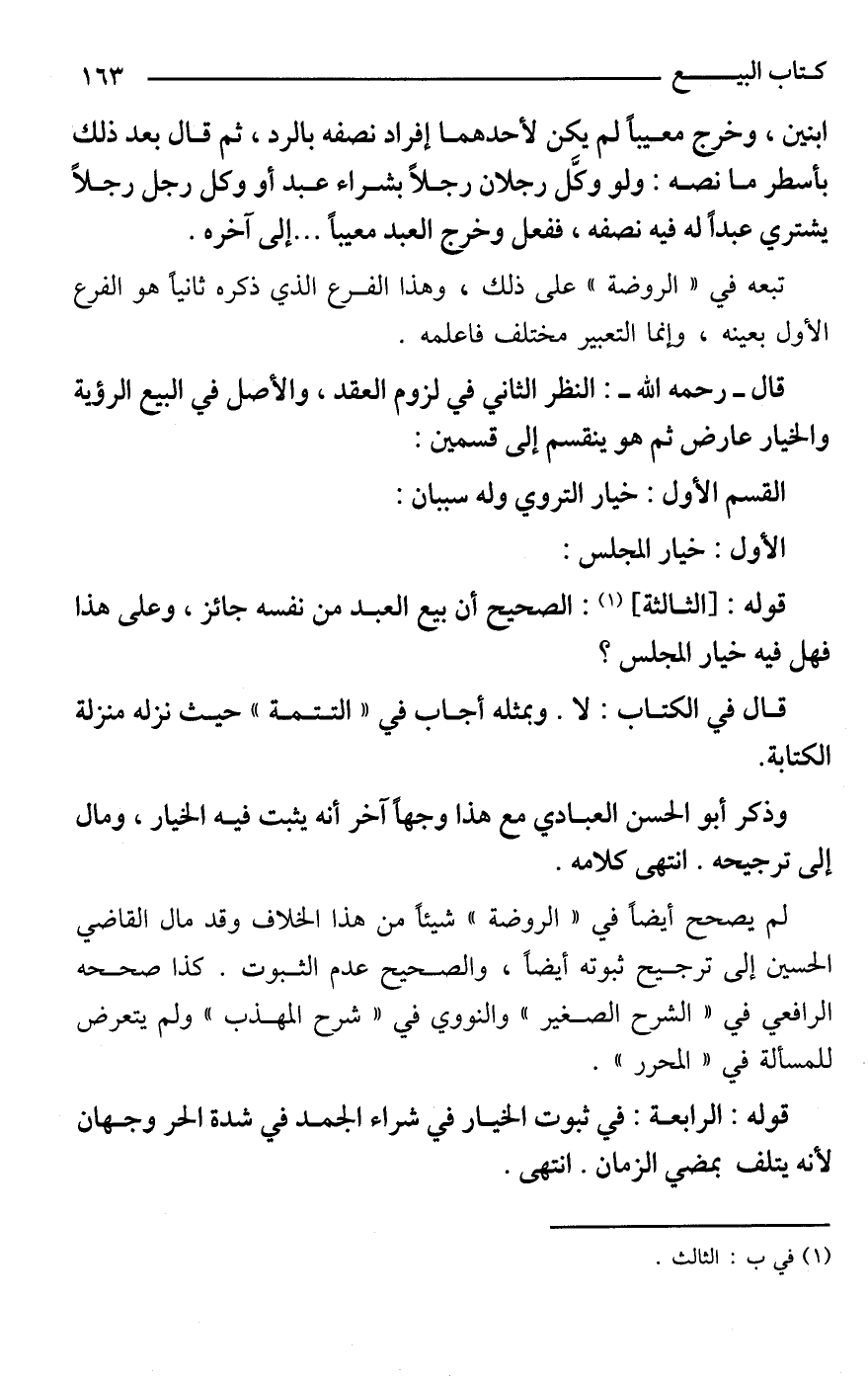 ابنين، وخرج معيبًا لم يكن لأحدهما إفراد نصفه بالرد، ثم قال بعد ذلك بأسطر ما نصه: ولو وكَّل رجلان رجلًا بشراء عبد أو وكل رجل رجلًا يشتري عبدًا له فيه نصفه، ففعل وخرج العبد معيبًا. . . . إلى آخره.
