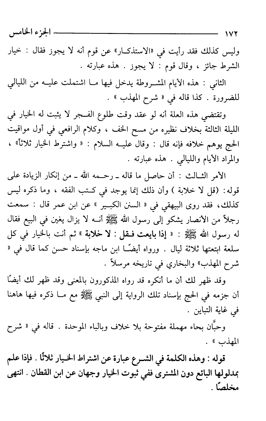 الأمر الثالث: أن حاصل ما قاله -رحمه الله- من إنكار الزيادة على قوله: (قل لا خلابة) وأن ذلك إنما يوجد في كتب الفقه، وما ذكره ليس كذلك، فقد روى البيهقي في "السنن الكبير" عن ابن عمر قال: سمعت رجلًا من الأنصار يشكو إلى رسول الله - صَلَّى اللَّهُ عَلَيْهِ وَسَلَّمَ - أنه لا يزال يغين في البيع فقال له رسول الله - صَلَّى اللَّهُ عَلَيْهِ وَسَلَّمَ -: "إذا بايعت فقل: لا خلابة" ثم أنت بالخيار في كل سلعة ابتعتها ثلاثة ليال. ورواه أيضًا ابن ماجه بإسناد حسن كما قال في "شرح المهذب" والبخاري في تاريخه مرسلًا.