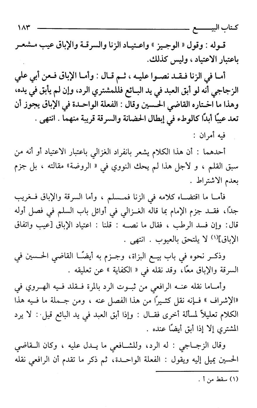 فأما ما اقتضاه كلامه في الزنا فمسلم، وأما السرقة والإباق فغريب جدًا، فقد جزم الإمام بما قاله الغزالي في أوائل باب السلم في فصل أوله قال: وإن فسد الرطب، فقال ما نصه: قلنا: اعتياد الإباق [عيب واتفاق الإباق] (¬1) لا يلتحق بالعيوب. انتهى.