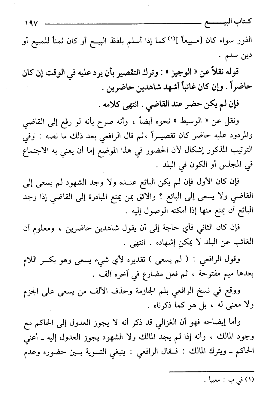 قوله نقلًا عن "الوجيز": وترك التقصير بأن يرد عليه في الوقت إن كان حاضرًا. وإن كان غائبًا أشهد شاهدين حاضرين.