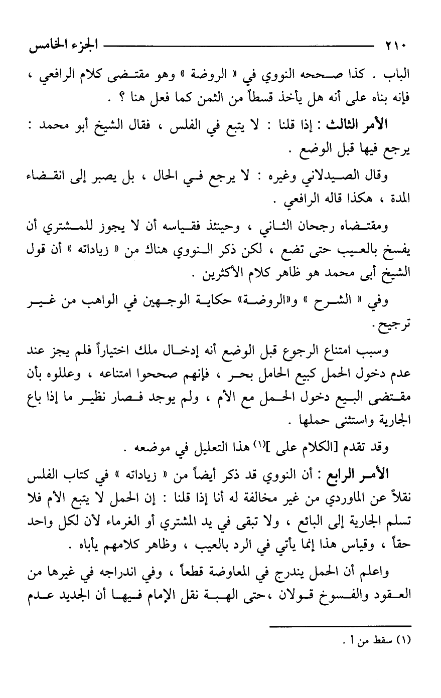الأمر الرابع: أن النووي قد ذكر أيضًا من "زياداته" في كتاب الفلس نقلًا عن الماوردي من غير مخالفة له أنا إذا قلنا: إن الحمل لا يتبع الأم فلا تسلم الجارية إلى البائع، ولا تبقى في يد المشتري أو الغرماء لأن لكل واحد حقا، وقياس هذا إنما يأتي في الرد بالعيب، وظاهر كلامهم يأباه.