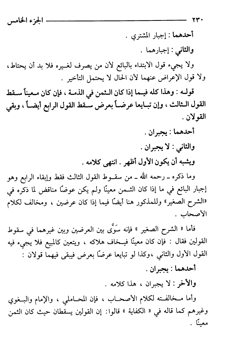 وما ذكره -رحمه الله- من سقوط القول الثالث فقط وإبقاء الرابع وهو إجبار البائع في ما إذا كان الثمن معينًا ولم يكن عوضًا مناقض لما ذكره في "الشرح الصغير" وللمذكور هنا أيضًا فيما إذا كان عرضين، ومخالف لكلام الأصحاب.