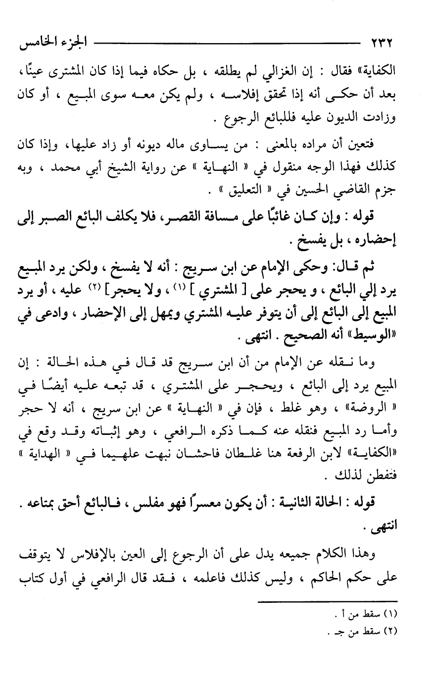 وما نقله عن الإمام من أن ابن سريج قد قال في هذه الحالة: إن المبيع يرد إلى البائع، ويحجر على المشتري، قد تبعه عليه أيضًا في "الروضة"، وهو غلط، فإن في "النهاية" عن ابن سريج، أنه لا حجر وأما رد البيع فنقله عنه كما ذكره الرافعي، وهو إثباته وقد وقع في "الكفاية" لابن الرفعة هنا غلطان فاحشان نبهت عليهما في "الهداية" فتفطن لذلك.