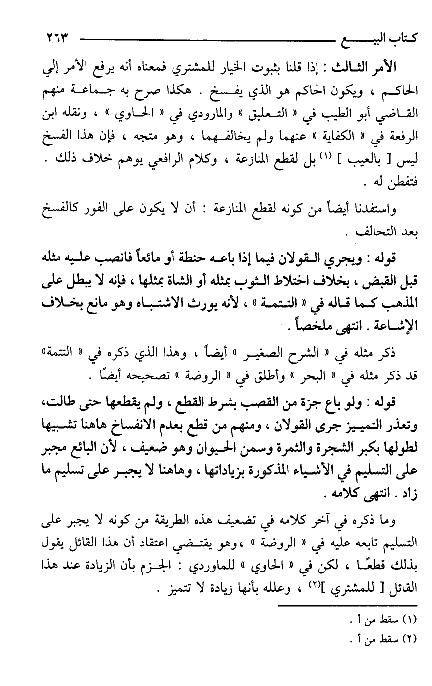الأمر الثالث: إذا قلنا بثبوت الخيار للمشتري فمعناه أنه يرفع الأمر إلي الحاكم، ويكون الحاكم هو الذي يفسخ. هكذا صرح به جماعة منهم القاضي أبو الطيب في "التعليق" والماوردي في "الحاوي"، ونقله ابن الرفعة في "الكفاية" عنهما ولم يخالفهما، وهو متجه، فإن هذا الفسخ ليس [بالعيب] (¬1) بل لقطع المنازعة، وكلام الرافعي يوهم خلاف ذلك. فتفطن له.