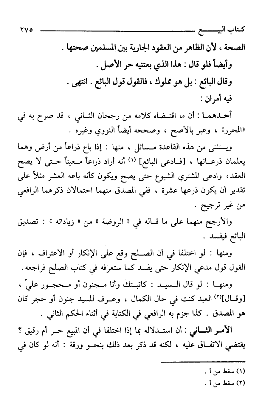 الأمر الثاني: أن استدلاله بما إذا اختلفا في أن المبيع حر أم رقيق؟ يقتضي الاتفاق عليه، لكنه قد ذكر بعد ذلك بنحو ورقة: أنه لو كان في