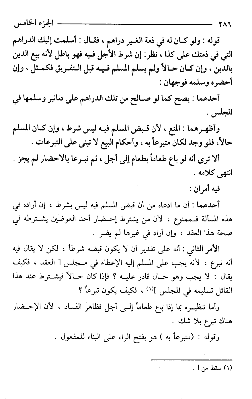 الأمر الثاني: أنه على تقدير أن لا يكون قبضه شرطًا، لكن لا يقال فيه أنه تبرع، لأنه يجب على المسلم إليه الإعطاء في مجلس [العقد، فكيف يقال: لا يجب وهو حال قادر عليه؟ فإذا كان حالًا فيشترط عند هذا القائل تسليمه في المجلس] (¬1)، فكيف يكون تبرعًا؟
