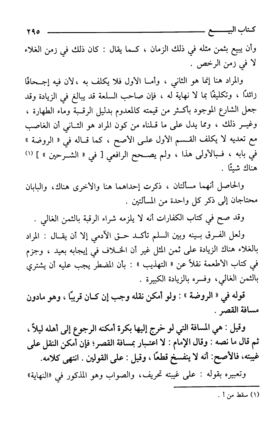 والمراد هنا إنما هو الثانى، وأما الأول فلا يكلف به، لأن فيه إجحافًا زائدًا، وتكليفًا بما لا نهاية له، فإن صاحب السلعة قد يبالغ في الزيادة وقد جعل الشارع الموجود بأكثر من قيمته كالمعدوم بدليل الرقبة وماء الطهارة، وغير ذلك، ومما يدل على ما قلناه من كون المراد هو الثاني أن الغاصب مع تعديه لا يكلف القسم الأول على الأصح، كما قاله في "الروضة" في بابه، فبالأولى هذا، ولم يصحح الرافعي [في "الشرحين"] (¬1) هناك شيئًا.