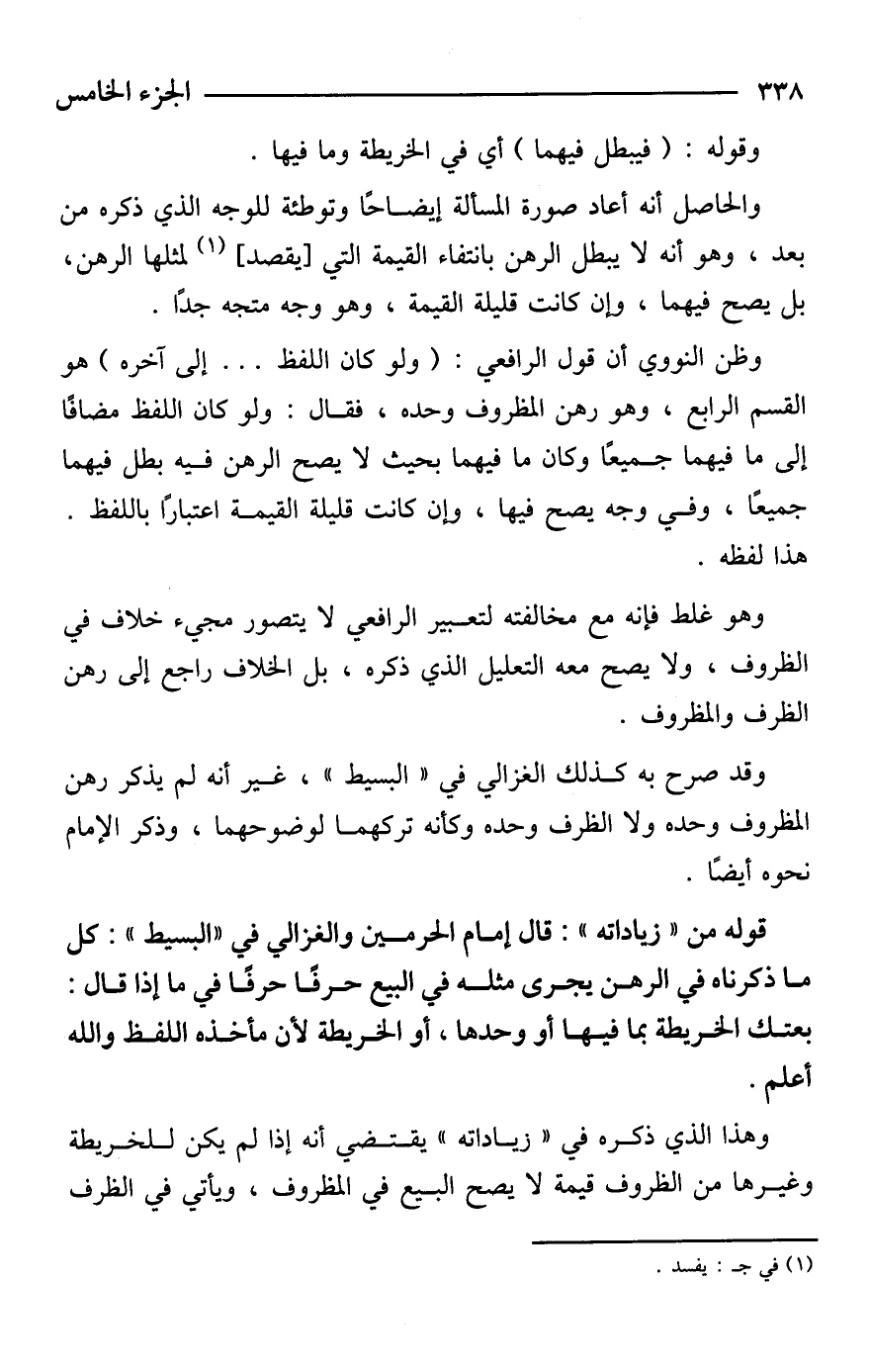 قوله من "زياداته": قال إمام الحرمين والغزالي في "البسيط": كل ما ذكرناه في الرهن يجرى مثله في البيع حرفًا حرفًا في ما إذا قال: بعتك الخريطة بما فيها أو وحدها، أو الخريطة لأن مأخذه اللفظ والله أعلم.