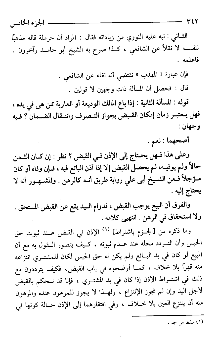 وعلى هذا فهل يحتاج إلى الإذن في القبض؟ نظر: إن كان الثمن حالًا ولم يوفيه، لم يحصل القبض إلا إذا أذن البائع فيه، فإن وفاه أو كان مؤجلًا فعن الشيخ أبى علي رواية طريق أنه كالرهن. والمشهور أنه لا يحتاج إليه.